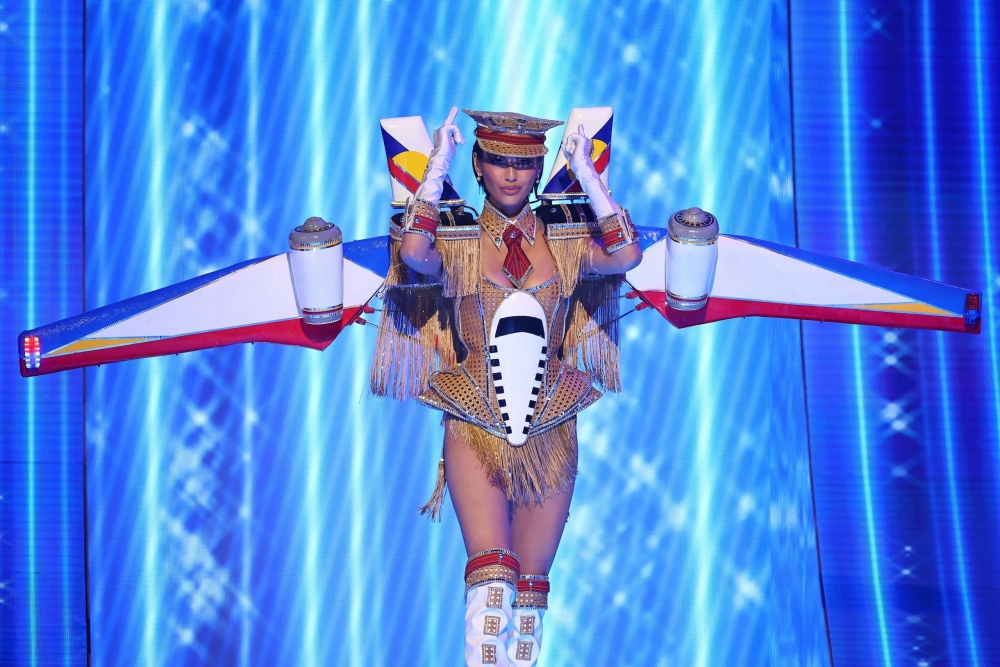 Thực hiện màn trình diễn an toàn trên máy bay trên đường băng, Hoa hậu Philippines đã bày tỏ lòng tôn kính với tư cách là quân nhân dự bị trong Lực lượng Không quân của đất nước với bộ trang phục hàng không và đôi cánh cỡ lớn.