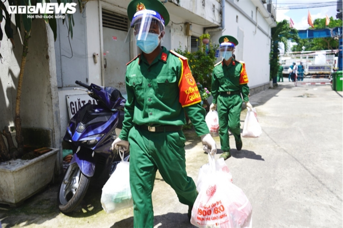 Nhiều bộ đội, dân quân tại phường Tân Thuận Tây, quận 7 hỗ trợ việc mua hàng, đóng gói. Ai cũng háo hức khi trở thành "shipper" bất đắc dĩ, vui vì được giúp mua đồ giao tận tay người dân.