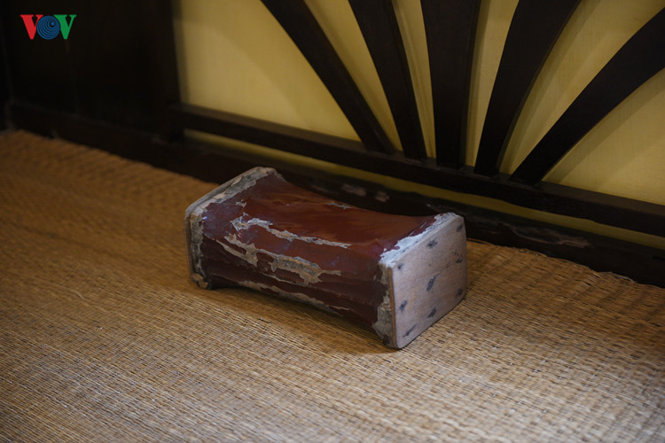 | Chiếc giường gỗ đơn sơ với tấm chiếu cói, chiếc gối gỗ nhỏ -nơi Bác nghỉ ngơi những ngày ở Vạn Phúc. |