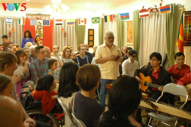| Đại sứ Venezuela tại Việt Nam Jorge Rondón (đứng-áo trắng) hào hứng biểu diễn cùng các nghệ sĩ khi hát về đất nước mình |
