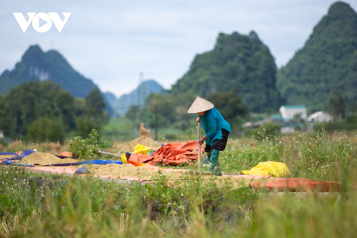 Người dân phơi thóc ngay trên cánh đồng, xa xa là những dãy núi trùng điệp.