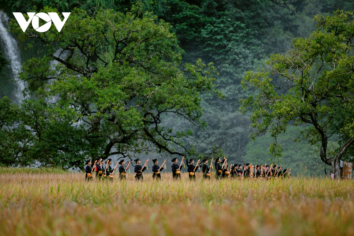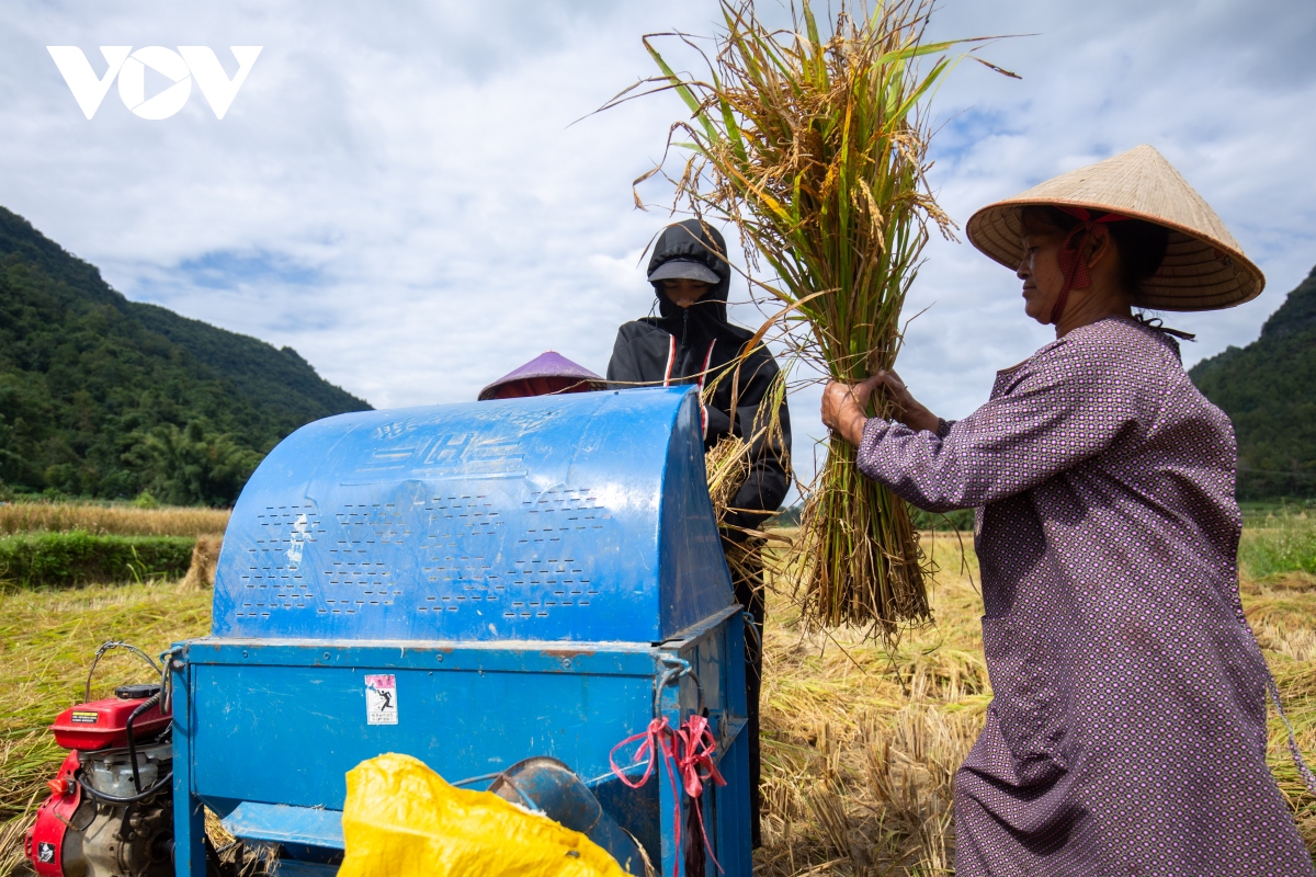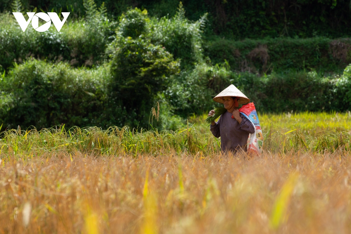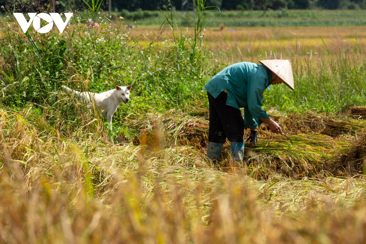 Bà con người Nùng thu hoạch lúa trên cánh đồng.