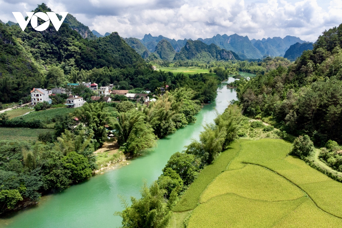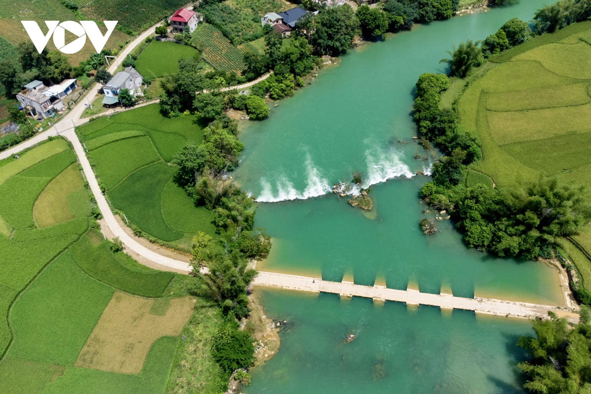 Dòng sông bốn mùa trong xanh màu ngọc bích, hai bên bờ được tô điểm bởi những ruộng lúa, tạo thành một bức tranh sơn thuỷ hữu tình đẹp mơ màng, bình dị.
