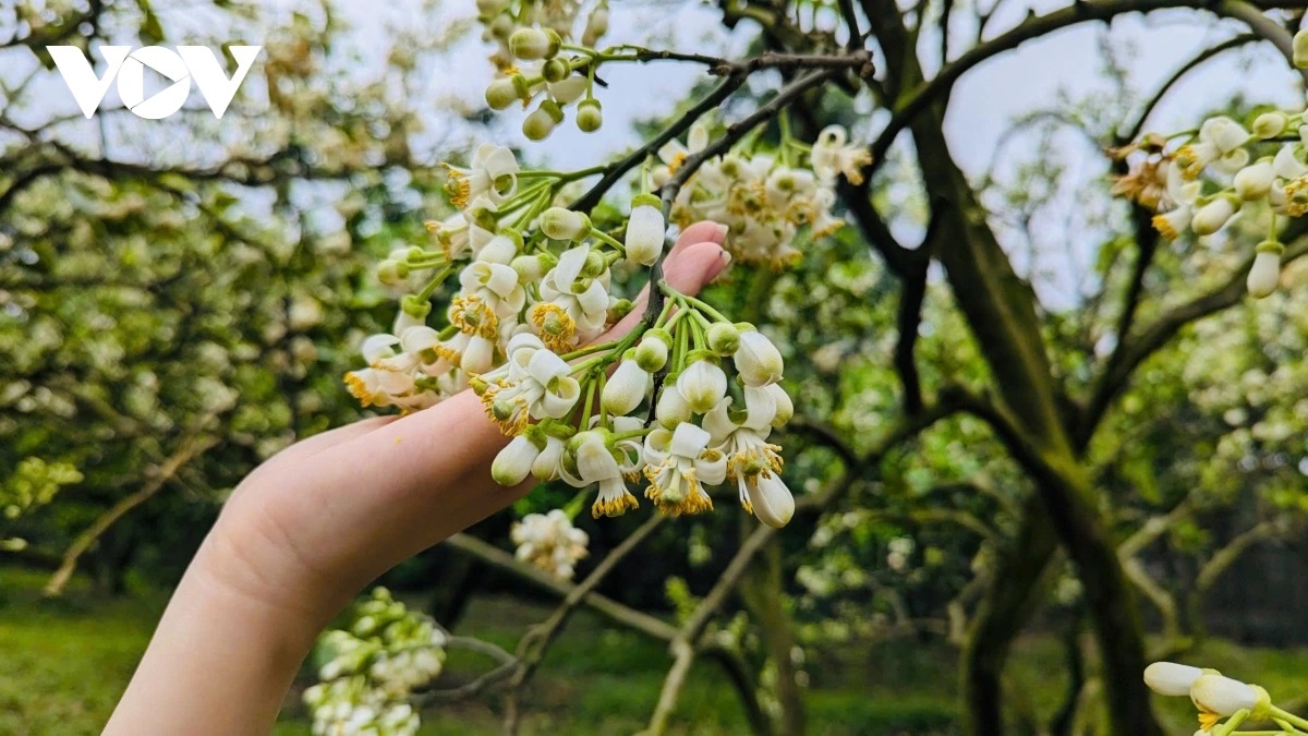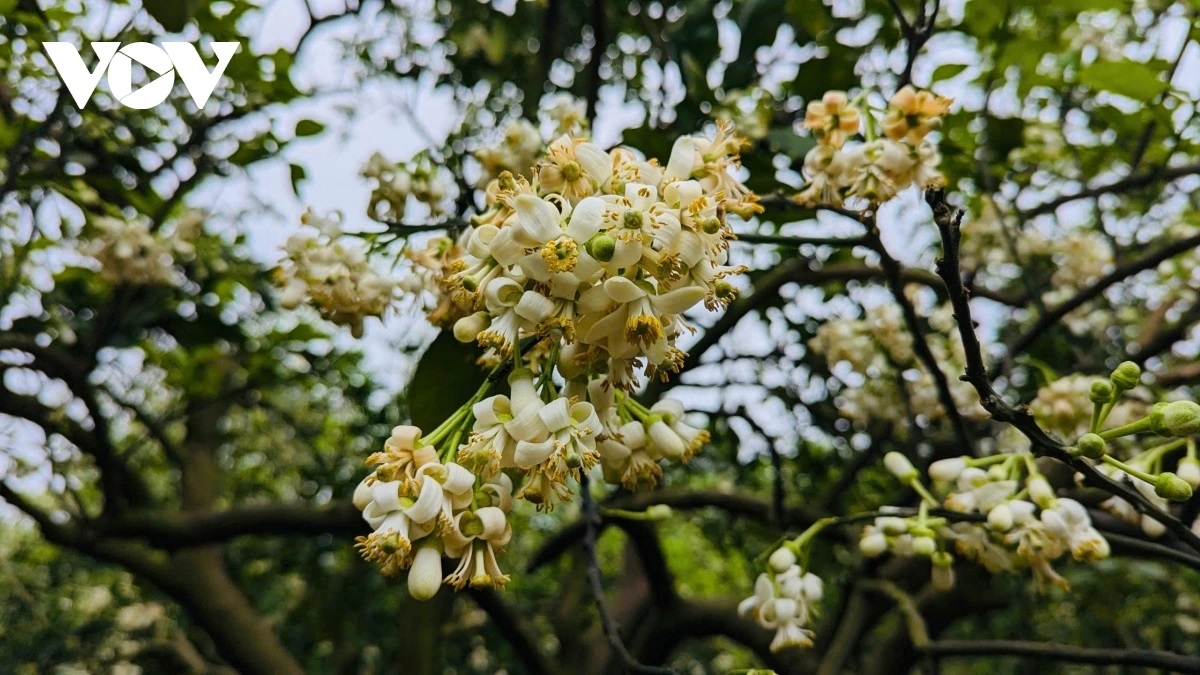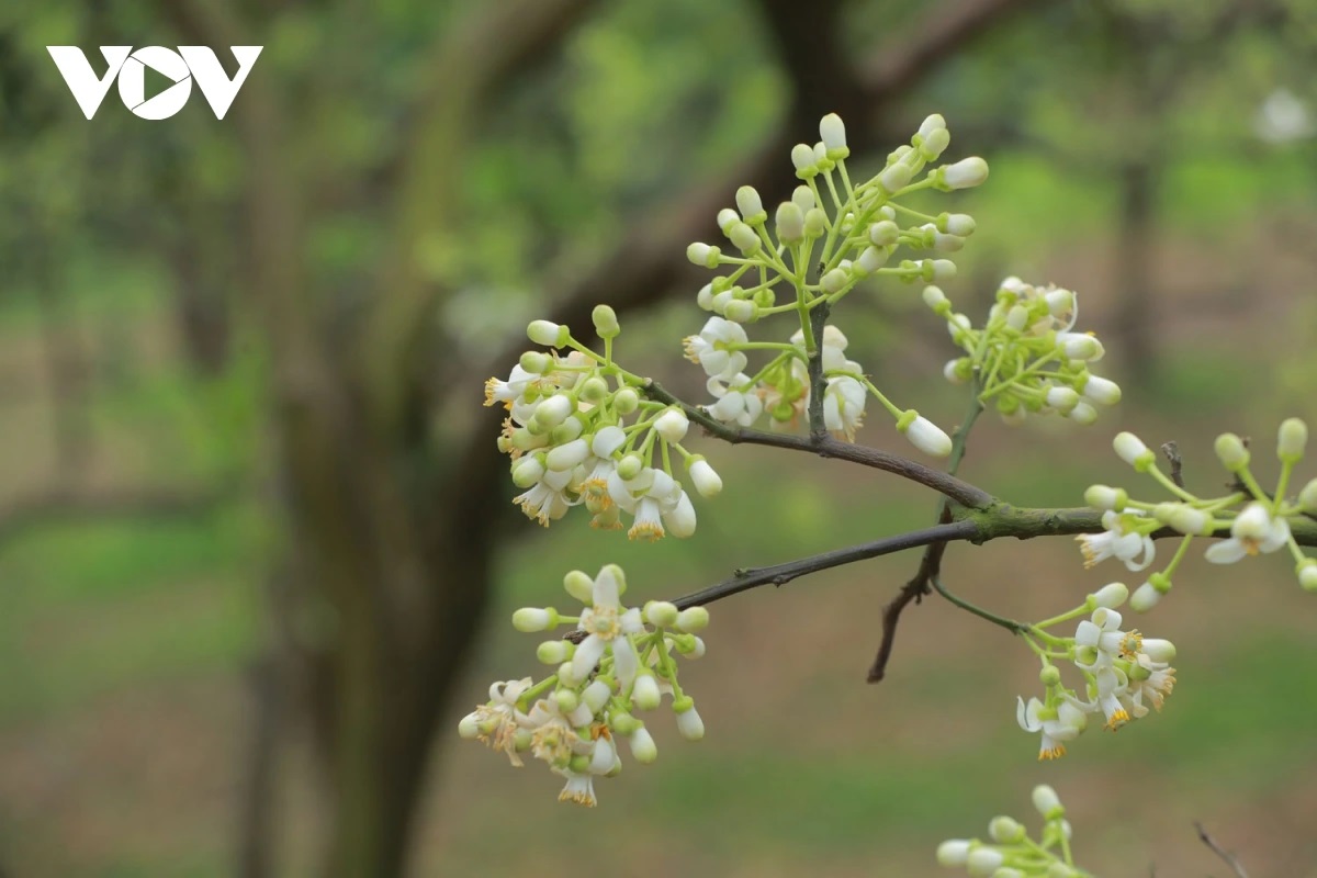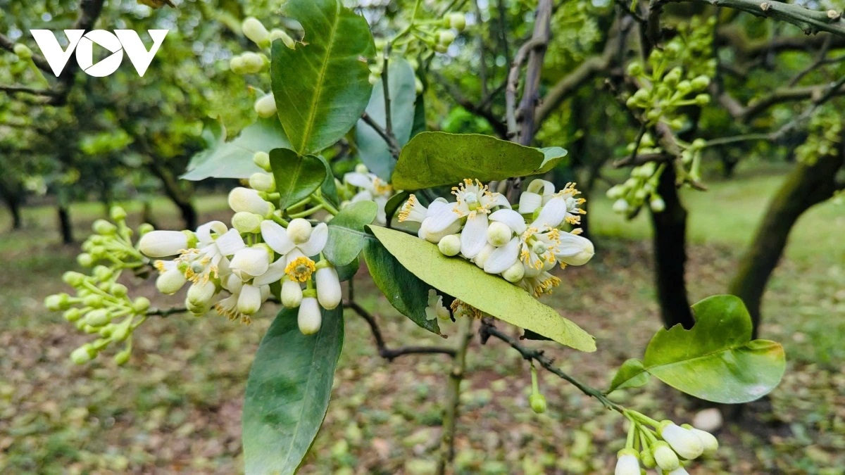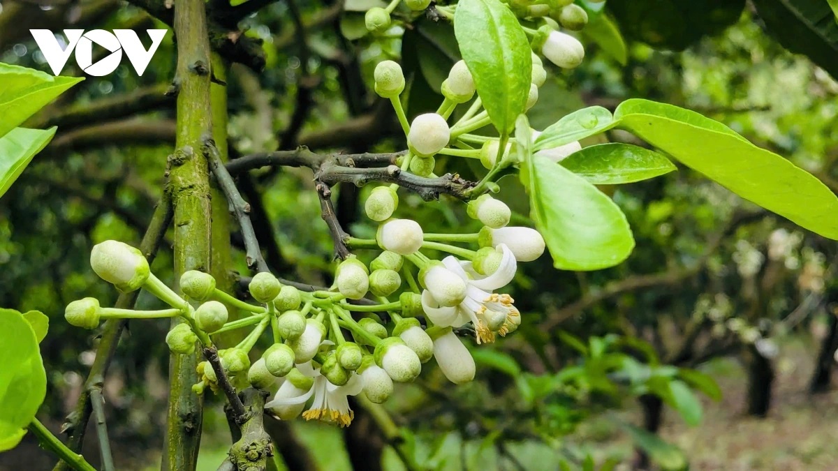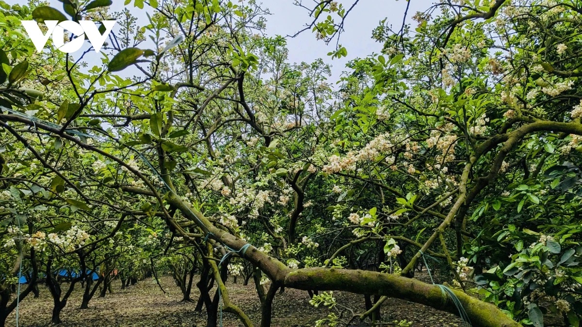 | Tại các vườn bưởi lâu năm, hoa bưởi nở trắng lối đi. Những thân cây cao, chi chít những chùm hoa bưởi đầu mùa. |