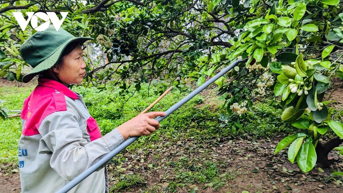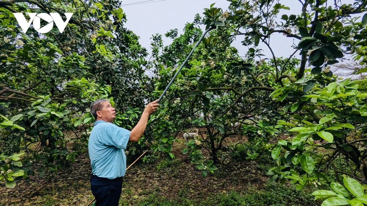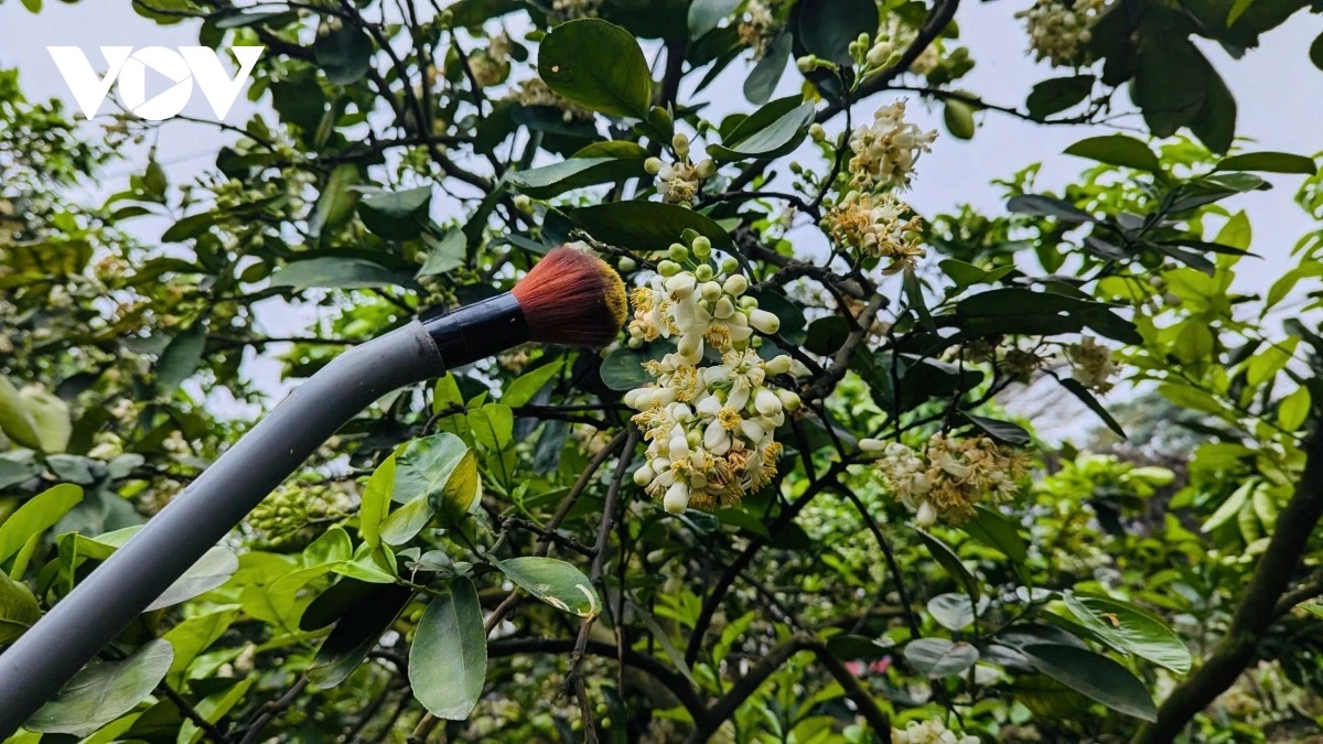 | Tháng 3 là mùa hoa bưởi nở rộ, các gia đình trồng bưởi Diễn tiến hành thụ phấn cho cây. |