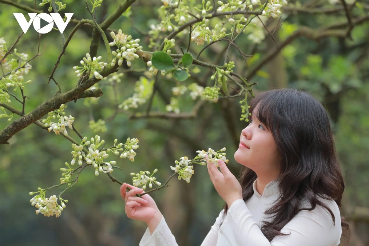 | Cánh hoa bưởi trắng ngần, mùi hương dịu dàng lan tỏa khắp khu vườn. Mùi hương ấy, vẻ đẹp của loài hoa ấy đã đi vào thi ca và đi vào cả những giấc mơ êm đềm của tuổi thơ biết bao thế hệ người dân làng Diễn. |