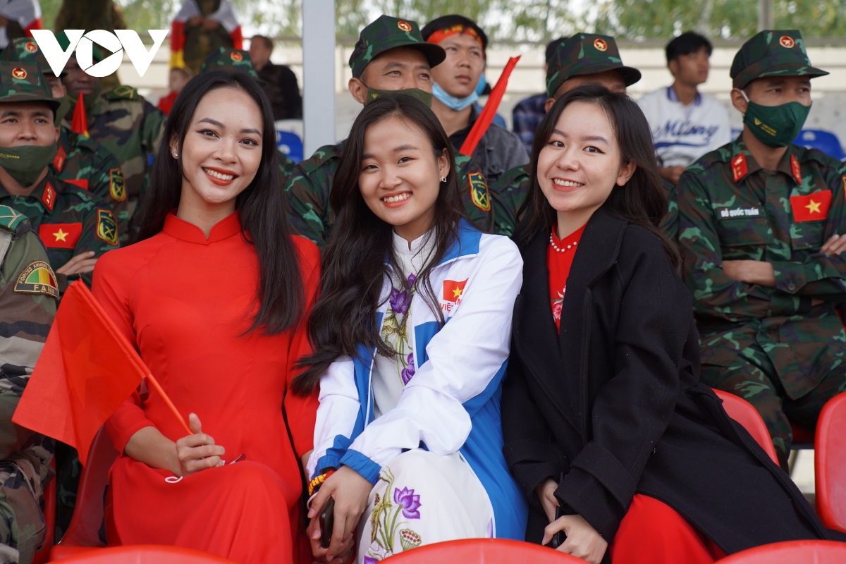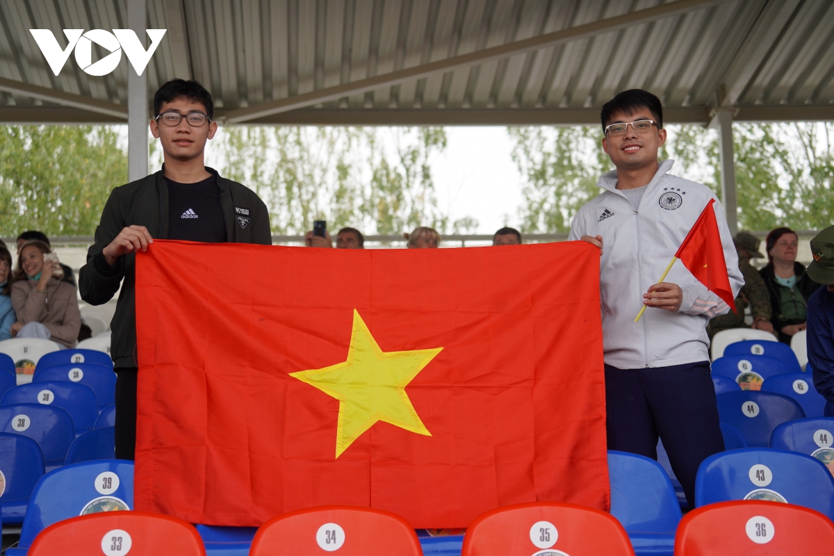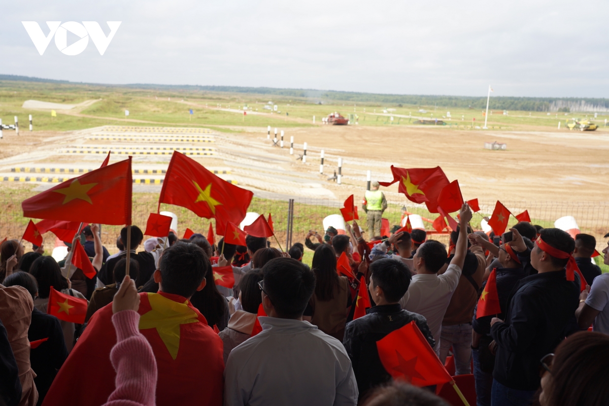 Ngày 26/8, kíp thứ hai của đội tuyển xe tăng Việt Nam tiếp tục tham gia thi đấu vòng loại trong nội dung “Xe tăng hành tiến”. Tiếp sức cho các chiến sỹ xe tăng quân đội nhân dân Việt Nam từ trên khán đài là đông đảo cổ động viên với rừng cờ đỏ sao vàng, băng rôn và những bài hát sôi động.
