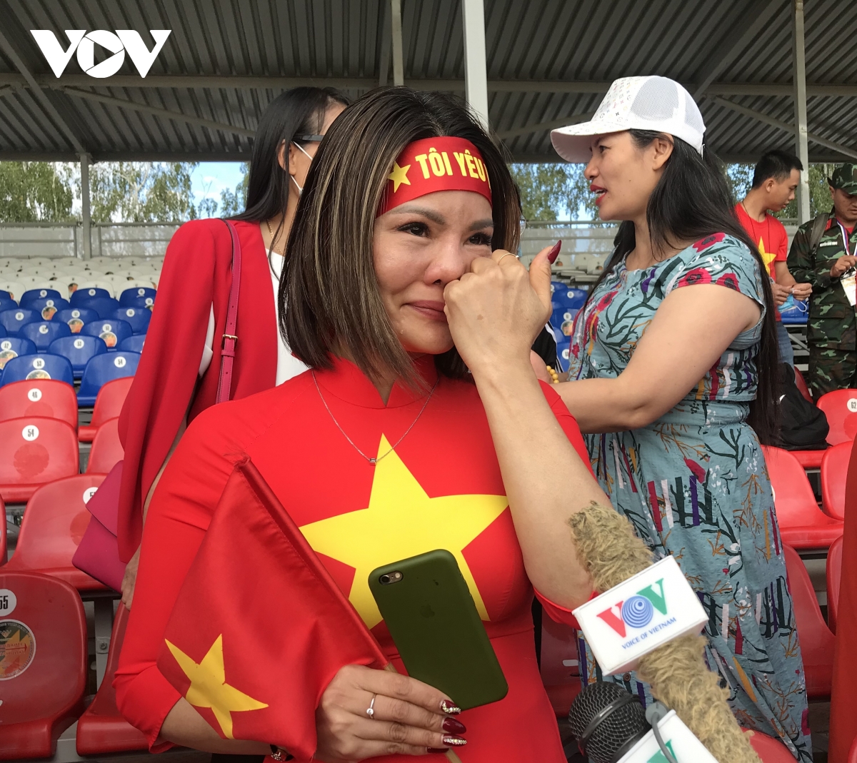 Một nữ cổ động viên đã bật khóc vì xúc động khi đội xe tăng Việt Nam khai hoả trúng mục tiêu. |
