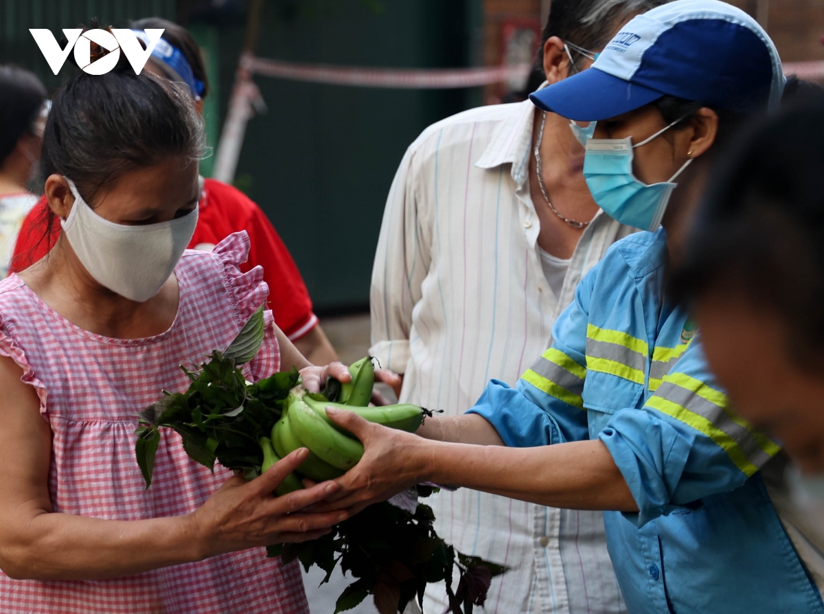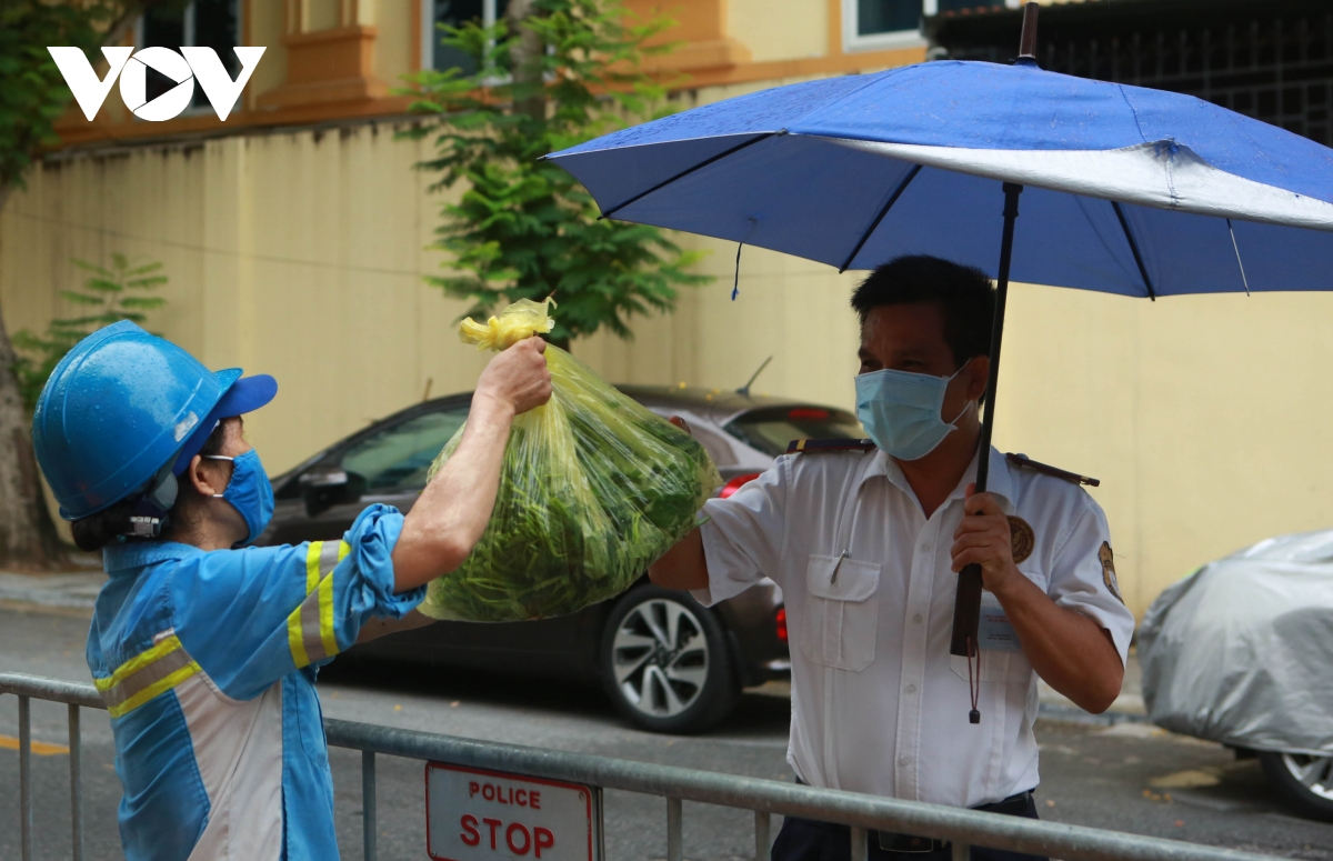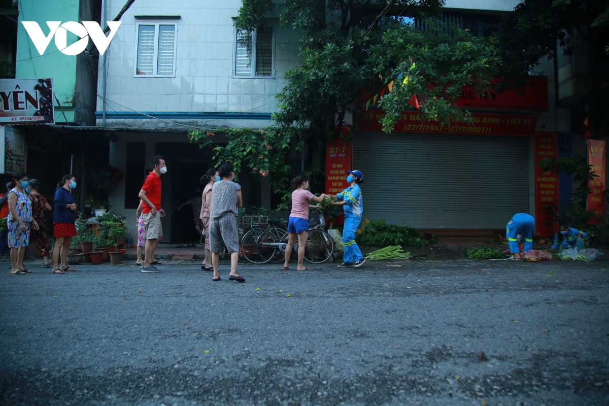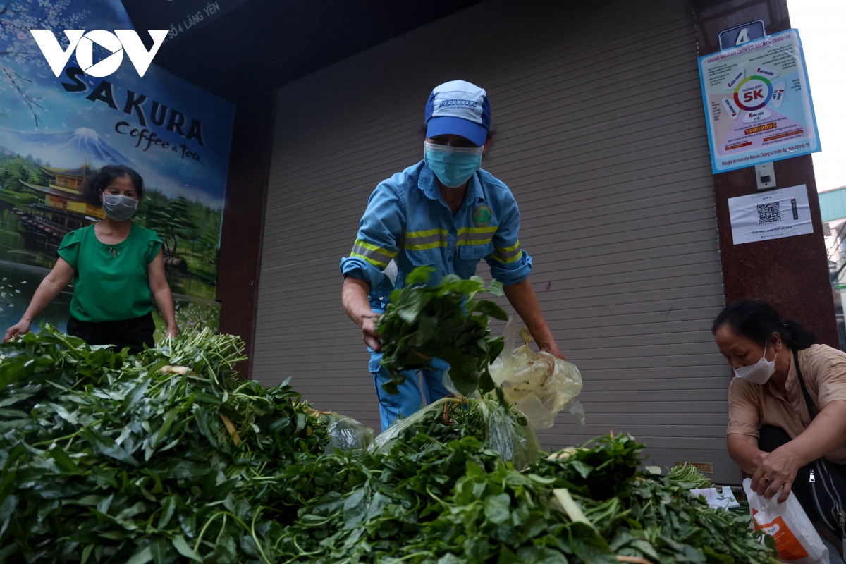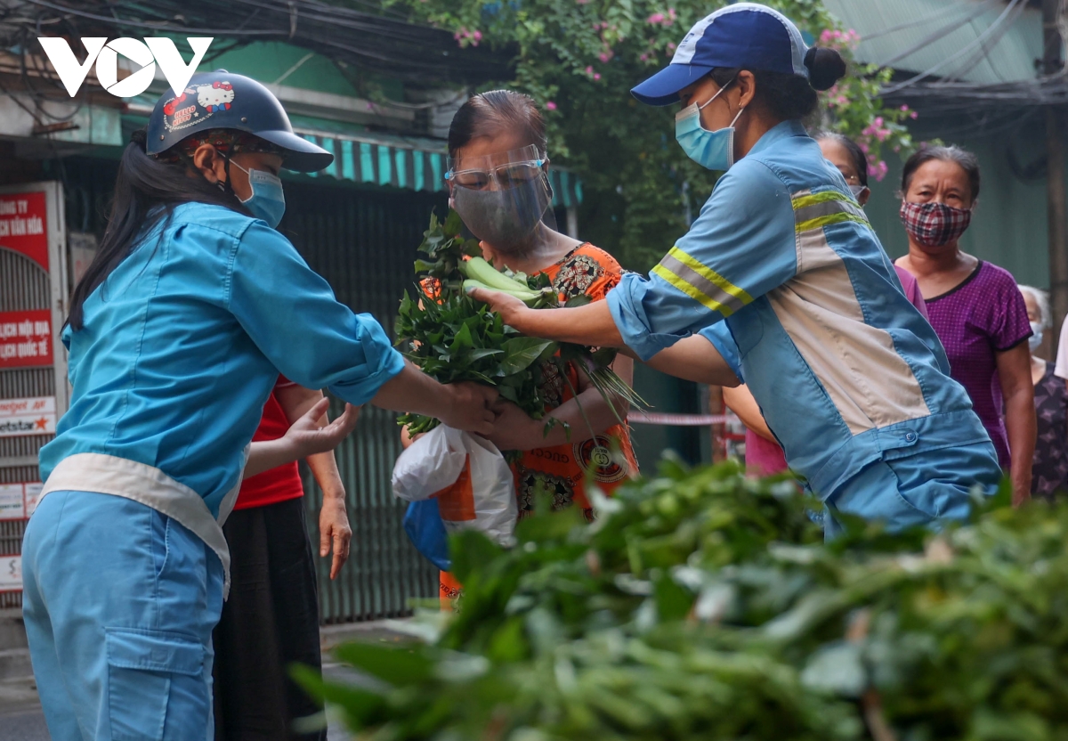 Những ngày qua, người dân trên con phố trung tâm của Hà Nội như Nguyễn Gia Thiều, Lãng Yên… đã quen với hình ảnh những người phụ nữ mặc áo công nhân môi trường mang tới nhu yếu phẩm, phát miễn phí cho nhiều người dân gặp khó khăn, đều đặn vào mỗi sáng. Từ 5h sáng hàng ngày những nữ lao công thay nhau chuẩn bị rau, củ, quả phát miễn phí cho người dân tại phố Bảo Linh (phường Phúc Tân, quận Hoàn Kiếm).