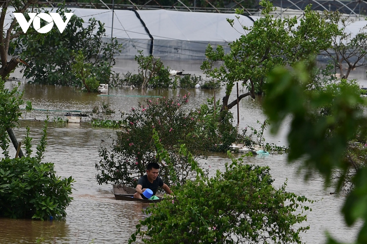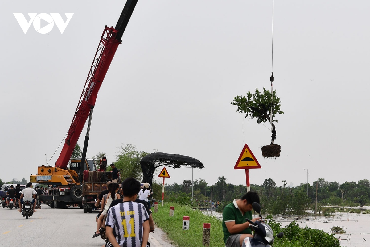 Địa bàn huyện Khoái Châu và Văn Giang của Hưng Yên là nơi trồng cây cảnh. Nước tràn về khiến nhiều vườn cây giá trị hàng chục tỷ đồng đứng trước nguy cơ mất trắng. |