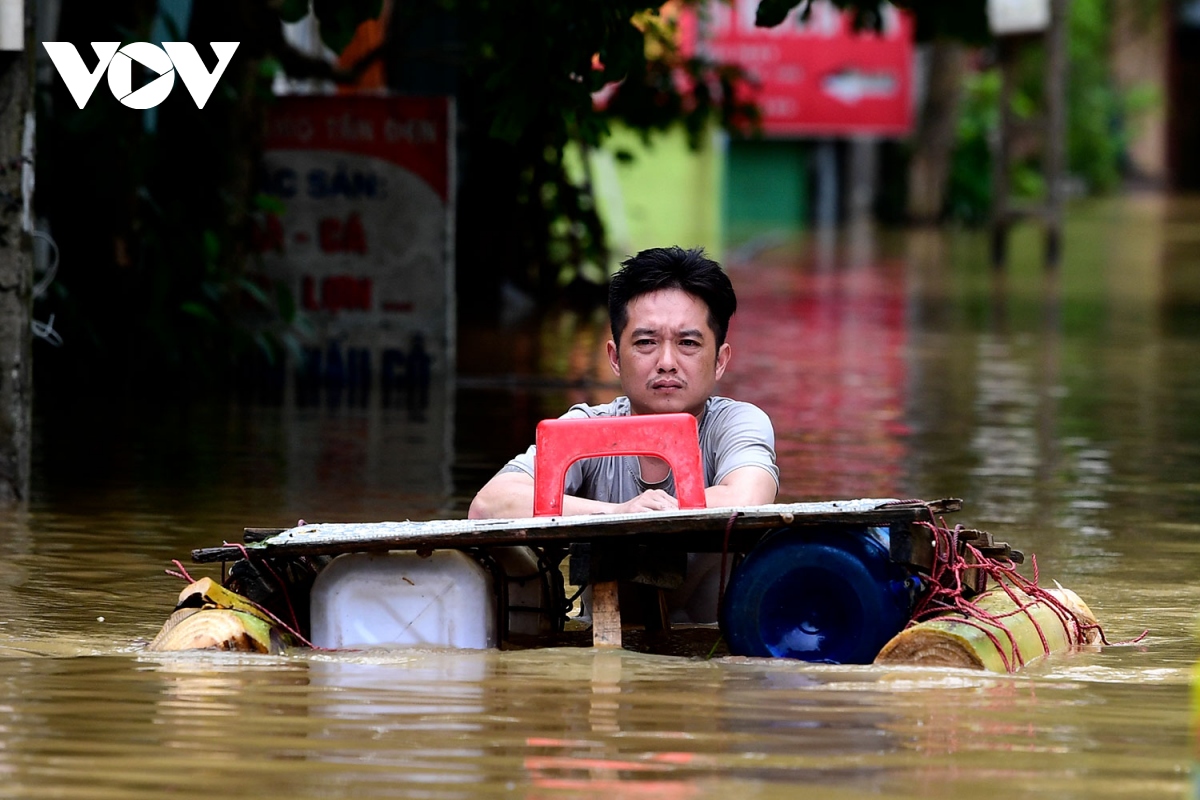 Một người dân phải làm bè tự chế để di chuyển trong nước. |