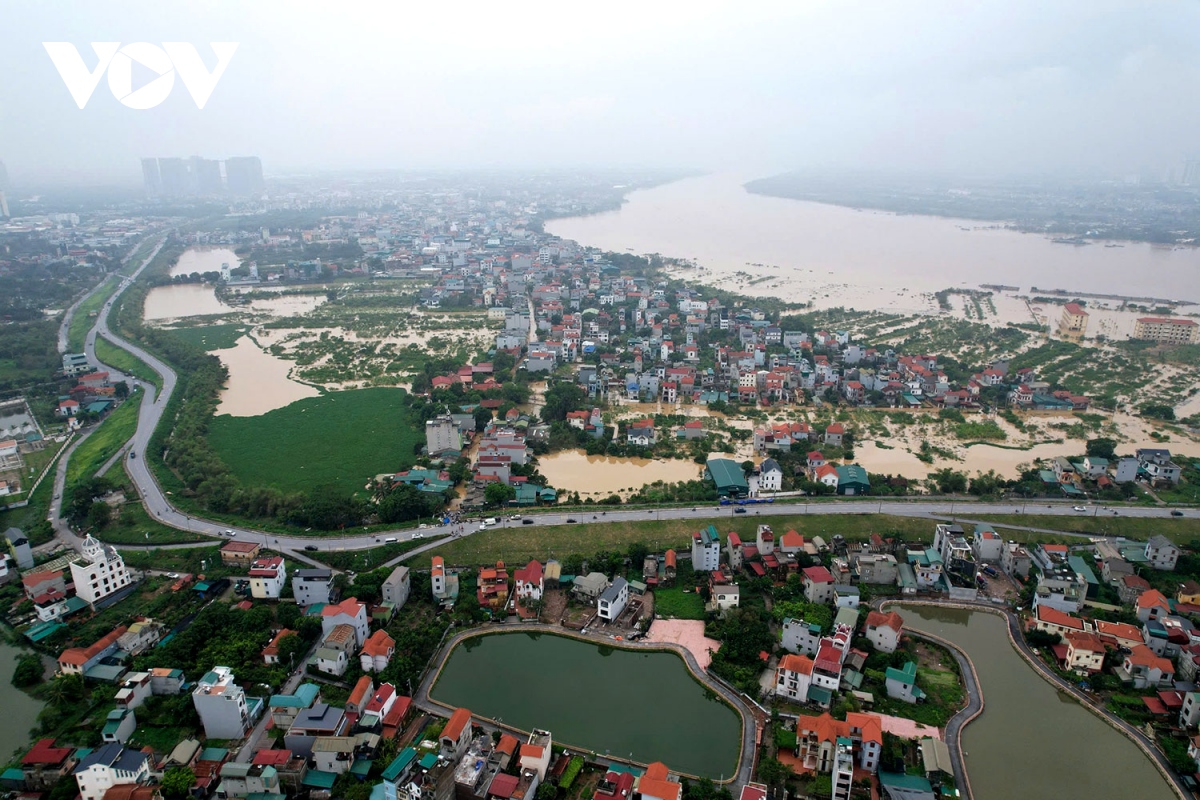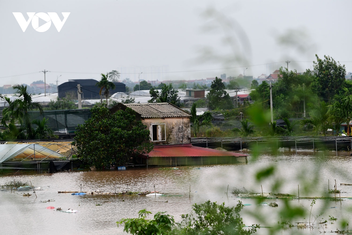 Toàn bộ khu vực ngoài đê chìm trong nước. |