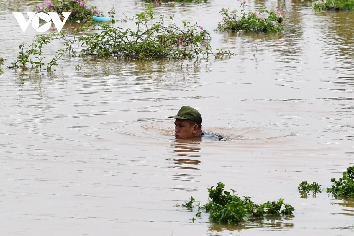 Một người dân đi kiểm tra vườn cây cảnh ngập chìm trong nước. |