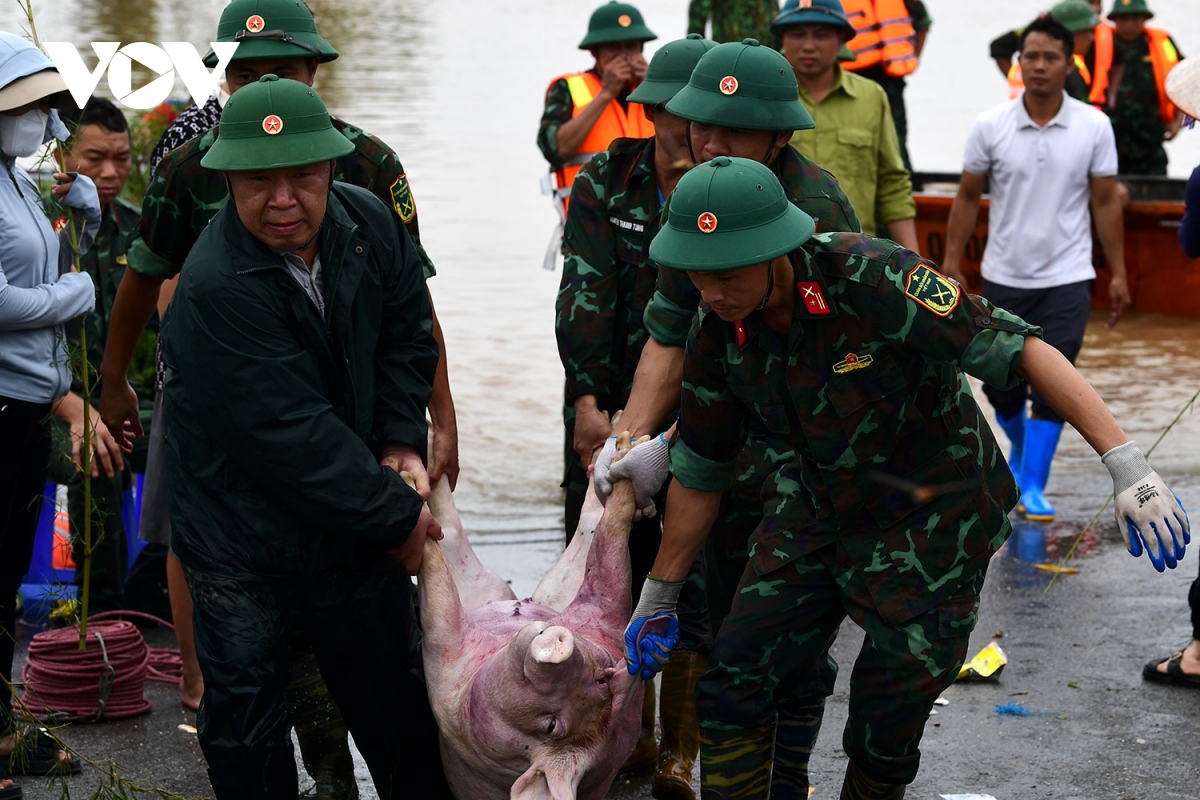 Lực lượng đang làm nhiệm vụ ứng phó với mưa, lũ tại xã Phụng Công huyện Văn Giang đến cứu tài sản cho nhân dân. |