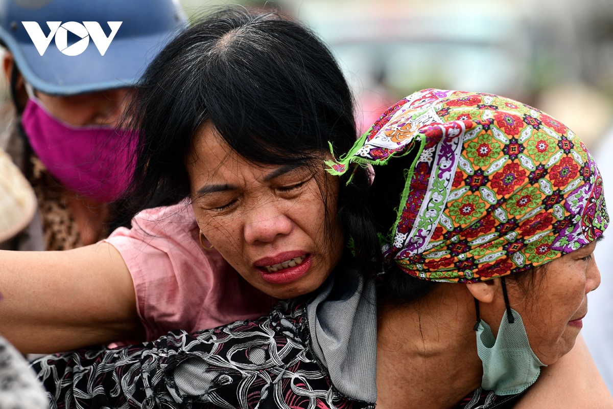 Bà Đinh Thị Lâm, 54 tuổi, sống tại thôn Mến, xã Phụng Công, Hưng Yên khóc ngất khi trang trại lợn gần 300 con của gia đình nhiều khả năng mất trắng do ngập sâu trong nước. |