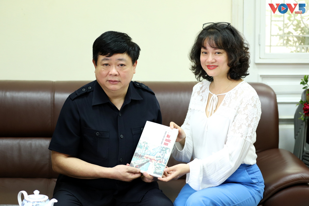 | Tác giả Nguyễn Thế Kỷ tặng sách nhà báo Nguyễn Mỹ Trà trong buổi phỏng vấn. ảnh: Đức Anh/VOV5 |