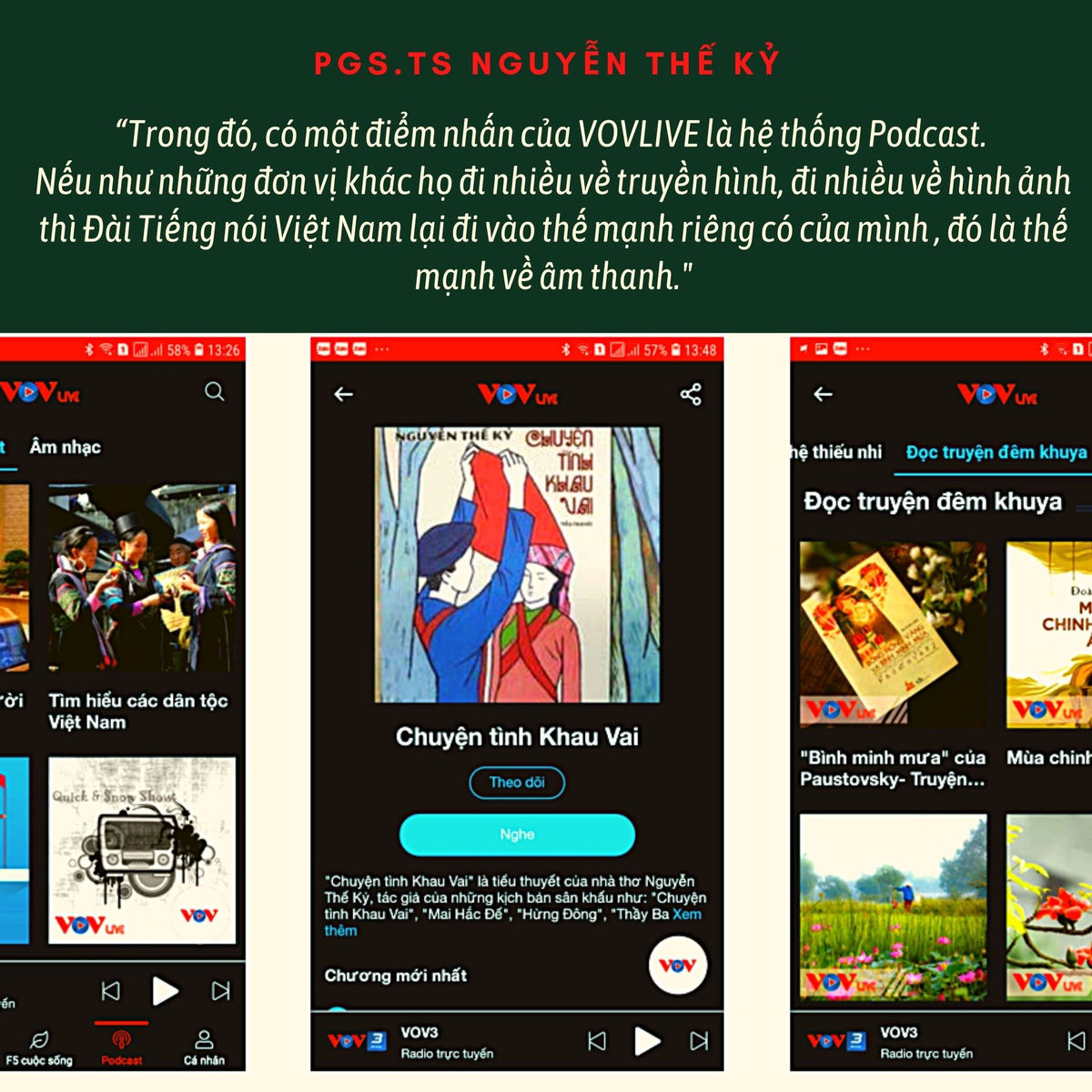 PSG.TS Nguyễn Thế Kỷ, Tổng giám đốc đài Tiếng nói Việt Nam đánh giá cao về hệ thống nội dung chương trình và Podcast trên VOVlive:“Trong đó có một điểm nhấn của VOVlive là hệ thống Podcast. Nếu như những đơn vị khác họ đi nhiều về truyền hình, đi nhiều về hình ảnh thì Đài Tiếng nói Việt Nam lại đi vào thế mạnh riêng có của mình, đó là thế mạnh về âm thanh. Đây cũng là một sự khác biệt, nói đúng ra thì cũng là sự vượt trội của Đài. Chúng tôi tin là ứng dụng này sẽ sớm được công chúng đón nhận và sẽ có sức lan tỏa rất lớn để đưa các giá trị, các nguồn tài nguyên, nội dung và văn hóa của Đài Tiếng nói Việt Nam đến với công chúng trong nước và nước ngoài.”