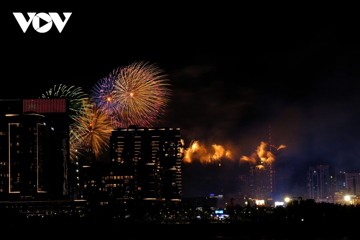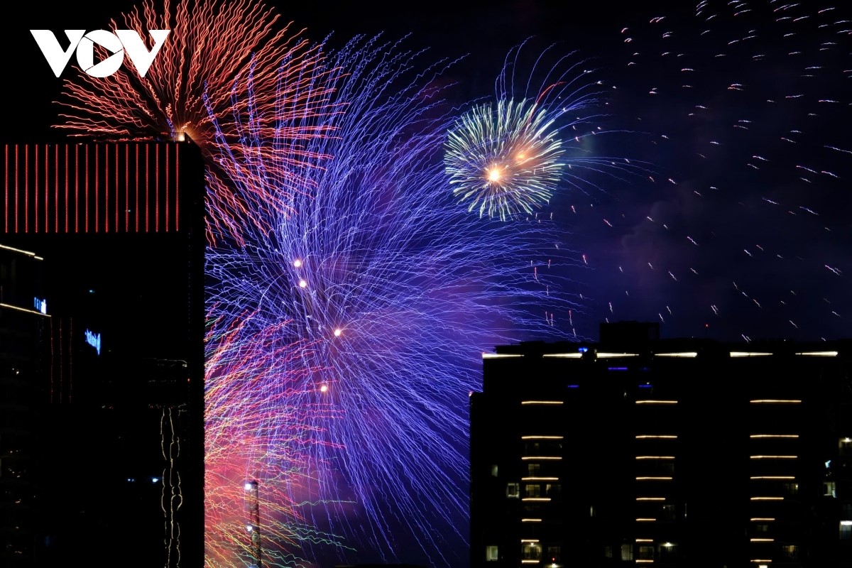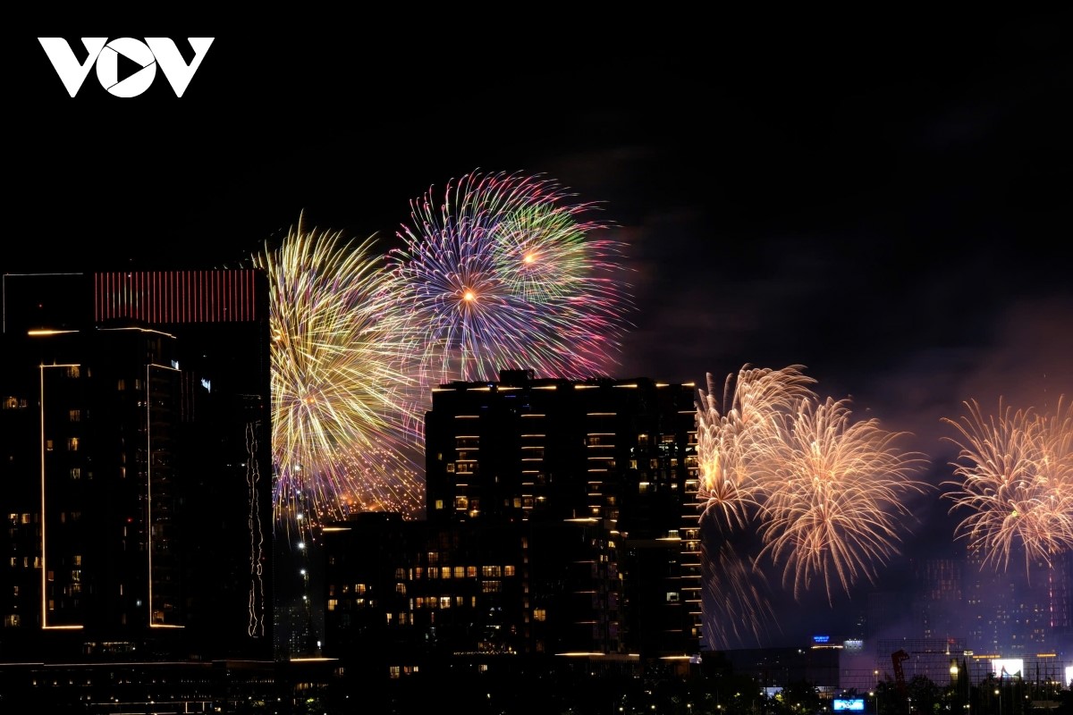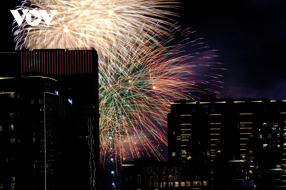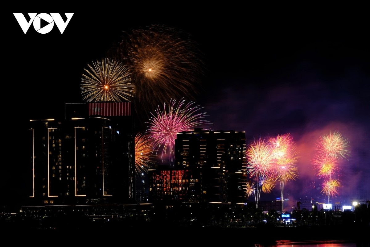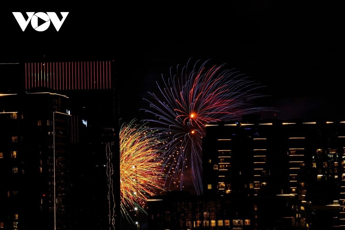 Từng đợt pháo hoa tung ra như một biểu tượng của niềm vui đoàn tụ và khát vọng hoà bình. |