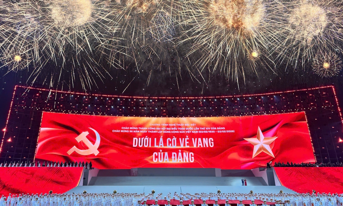 Với chủ đề “Tầm nhìn mới - Kỷ nguyên mới”, Chương trình nghệ thuật đặc biệt "Dưới lá cờ vẻ vang của Đảng" không chỉ là lời chào mừng thành công của kỳ Đại hội lần thứ XIV mà còn là khúc tráng ca kỷ niệm 96 năm ngày thành lập Đảng Cộng sản Việt Nam (3/2/1930 - 3/2/2026). Ảnh: VTV