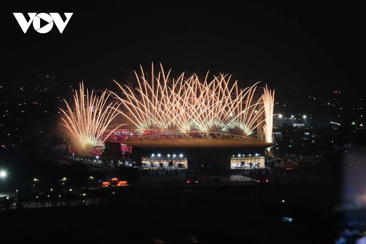 Không gian sân vận động được biến hóa thành một sân khấu khổng lồ với hệ thống âm thanh, ánh sáng hiện đại bậc nhất. Ảnh: VTV