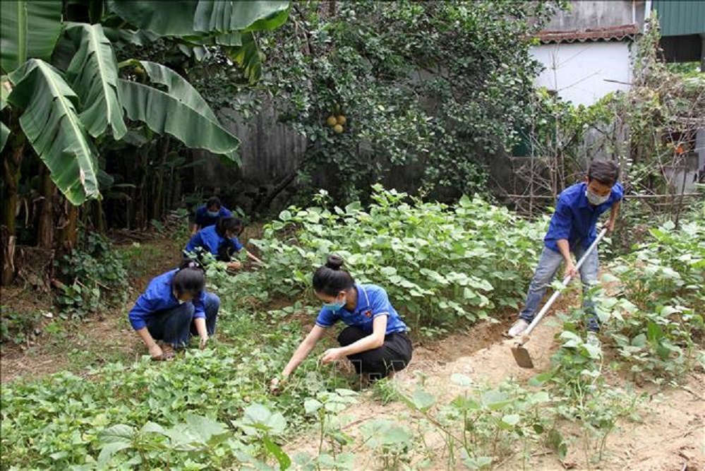 Các đoàn viên thanh niên dọn dẹp nhà cửa, vệ sinh vườn cho mẹ Ngô Thị Đỉu. Ảnh: TTXVN