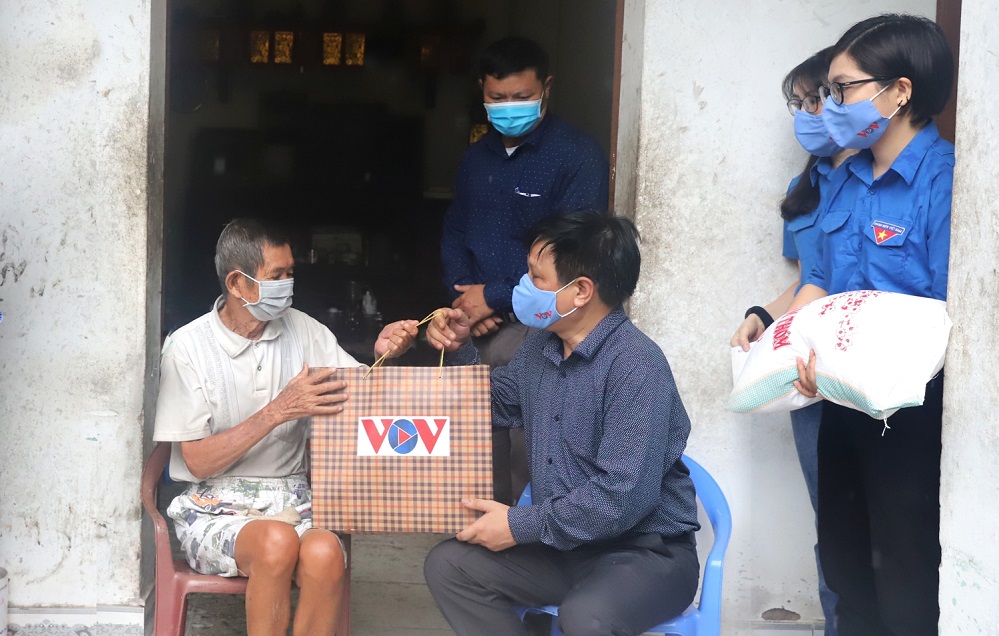 10 suất quà bao gồm gạo, nhu yếu phẩm, khẩu trang, nước sát khuẩn và tiền mặt được trao tận tay các gia đình là thương binh, người nhà liệt sĩ neo đơn, thường xuyên đau ốm, người nhiễm chất độc hoá học hoàn cảnh khó khăn. Ảnh: VOV