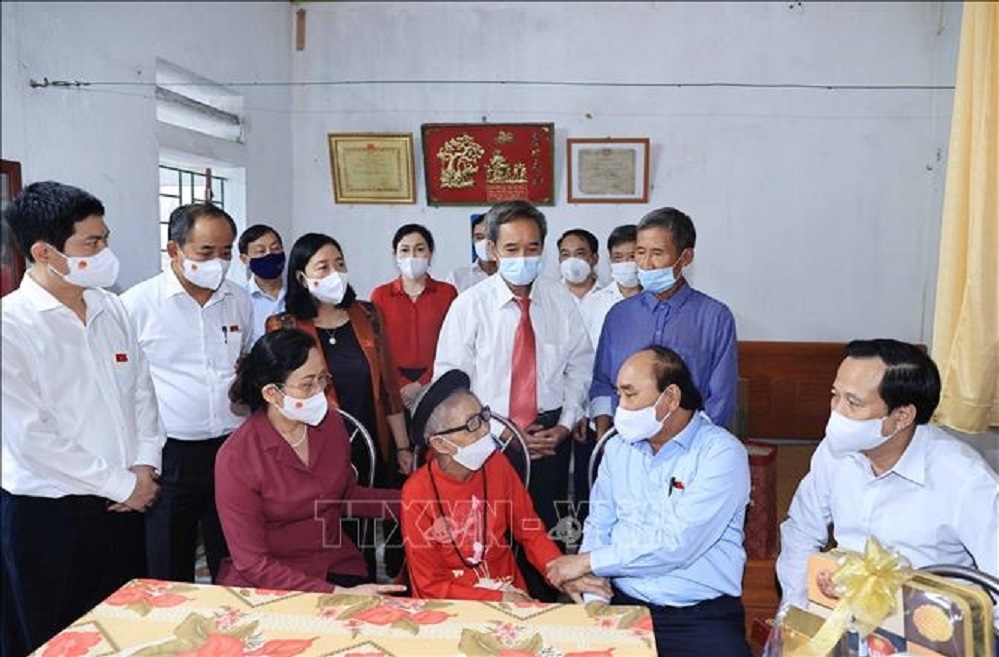 Chủ tịch nước Nguyễn Xuân Phúc thăm hỏi và tặng quà Bà mẹ Việt Nam anh hùng Nguyễn Thị Mờn ở Hà Nam. Ảnh: TTXVN