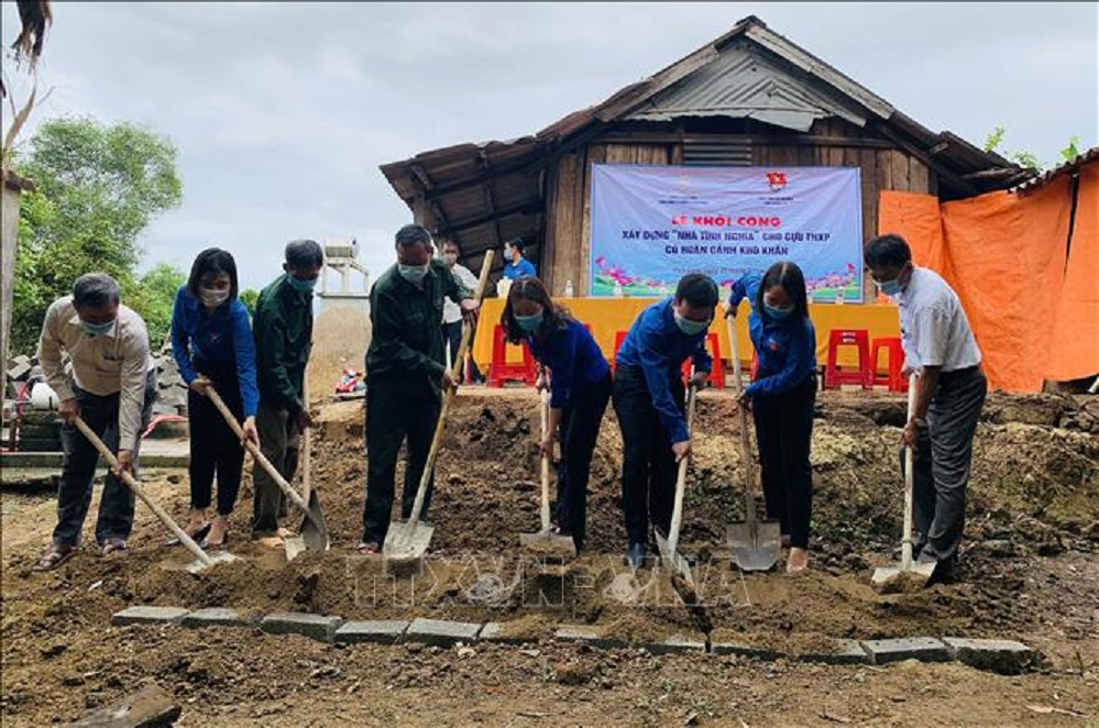 Ban tổ chức khởi công xây dựng nhà tình nghĩa cho các cựu Thanh niên xung phong có hoàn cảnh khó khăn. Ảnh: TTXVN |