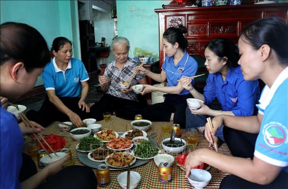 “Bữa cơm tri ân” tại gia đình mẹ Ngô Thị Đỉu vợ liệt sĩ Ngô Xuân Tấn. Ảnh: TTXVN |