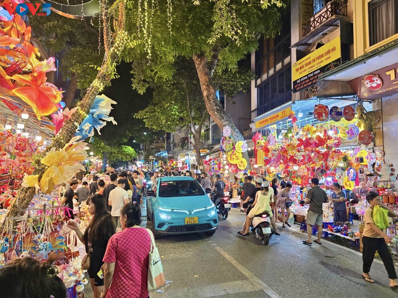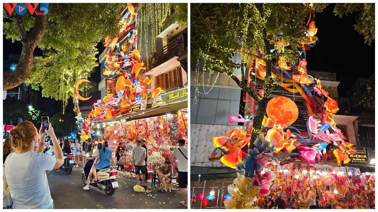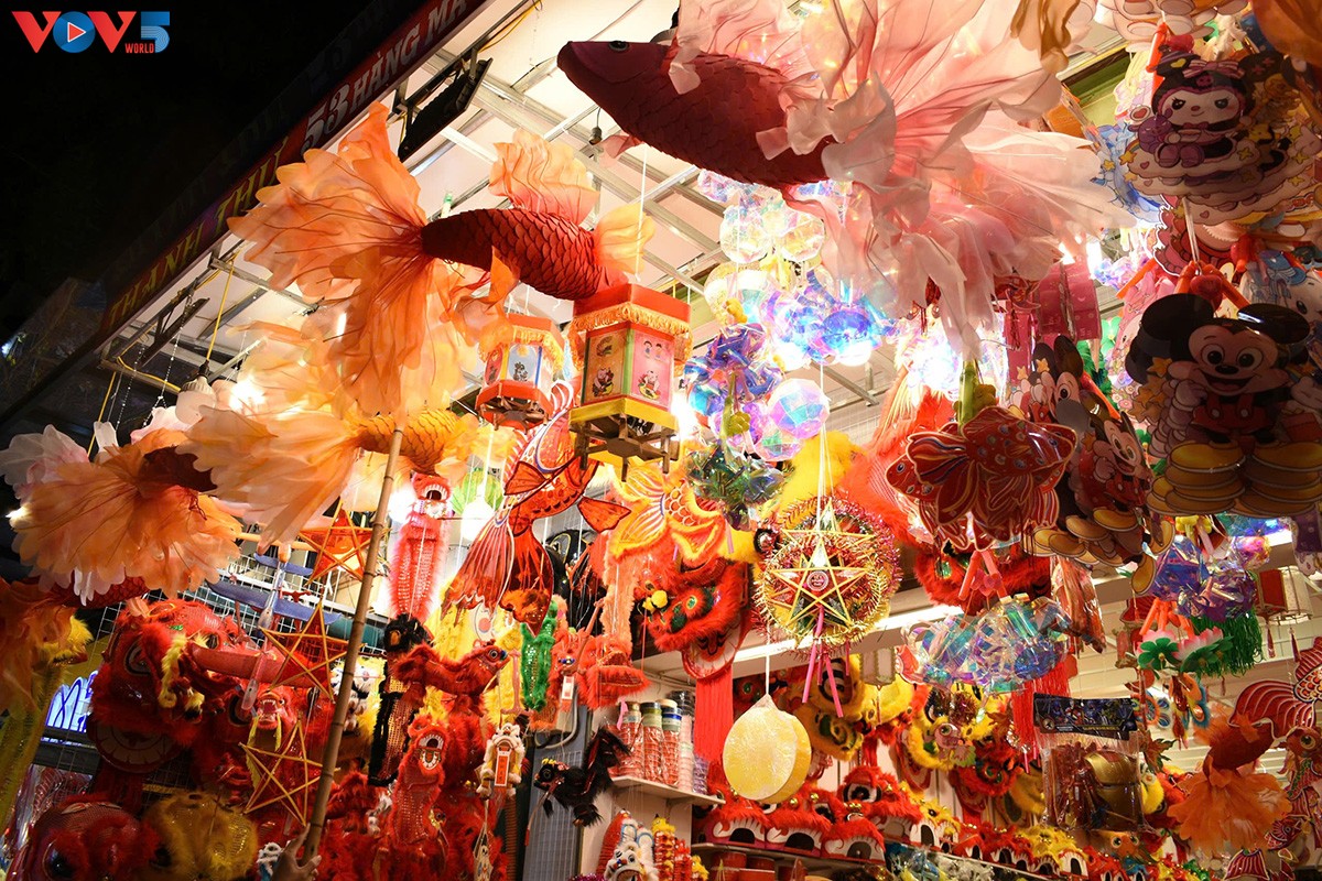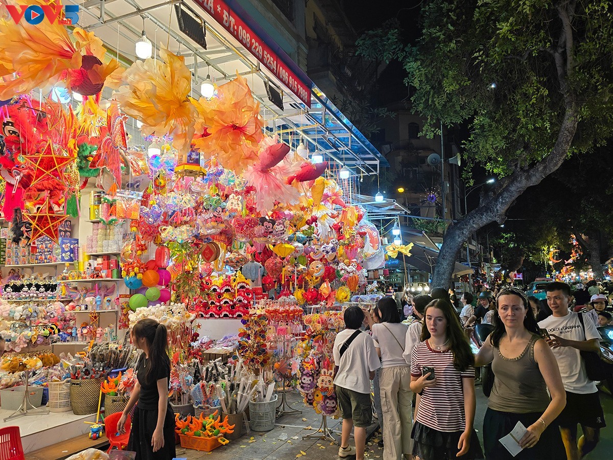 | Từ tối, phố Hàng Mã đã được “nhuộm đỏ” và thắp sáng bởi hàng nghìn chiếc đèn lồng, đèn ông sao và vô vàn đồ chơi, đồ trang trí bắt mắt. Năm nay, các mặt hàng đồ chơi Trung thu được trưng bày sớm hơn, mẫu mã đa dạng hơn. Ảnh: Hà Phương/VOV5. |