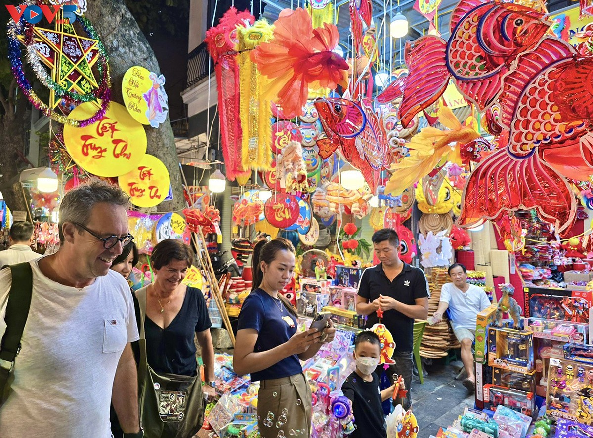 | Nhiều du khách nước ngoài tỏ ra tò mò và thích thú khi đi dạo quanh phố Hàng Mã. Nơi đây không chỉ là nơi bày bán các mặt hàng thủ công, mà còn là điểm đến lý tưởng cho du khách nước ngoài tới tìm hiểu và trải nghiệm lễ hội truyền thống của Việt Nam. Ảnh: Hà Phương/VOV5. |