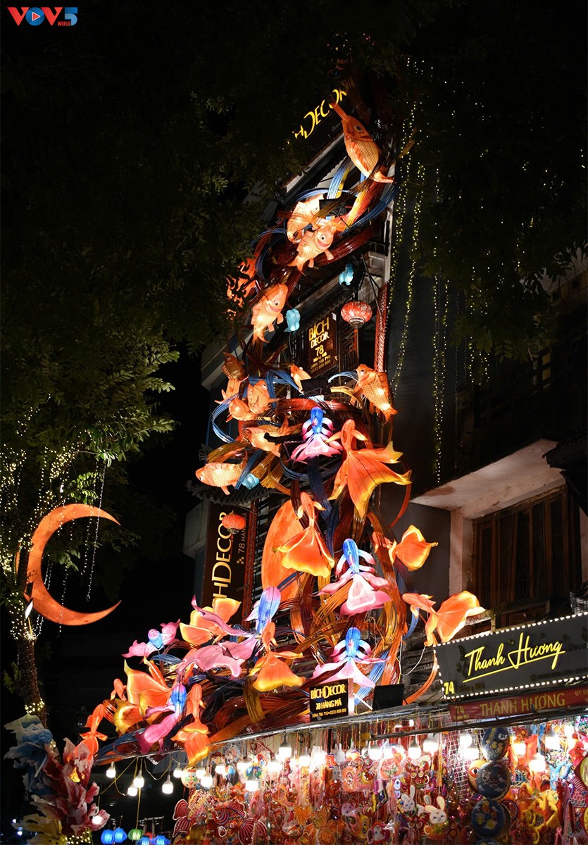 | Điểm nhấn của khu phố năm nay là mô hình đàn cá chép trông trăng khổng lồ trải dọc ba tầng nhà. Đây là tác phẩm “độc nhất vô nhị” của cửa hàng Bích Decor – 78 Hàng Mã. Chia sẻ với phóng viên, chị Đào Thị Bích - chủ cửa hàng cho biết toàn bộ ý tưởng, thiết kế, thi công đều do cửa hàng chị tự làm. Chi phí đầu tư lên tới gần 300 triệu, thời gian thi công khoảng 1 tuần. Nhờ giao diện quá đặc sắc, công việc buôn bán của cửa hàng thuận lợi hơn, nườm nượp người tới check-in, chụp ảnh đem lại hiệu ứng truyền thông khá tốt, từ đó doanh thu cũng tăng gấp nhiều lần. Ảnh: Hà Phương/VOV5. |