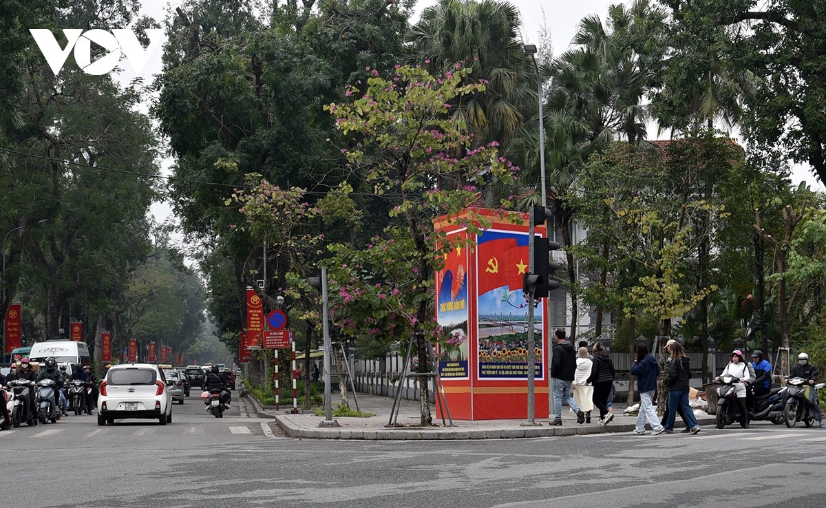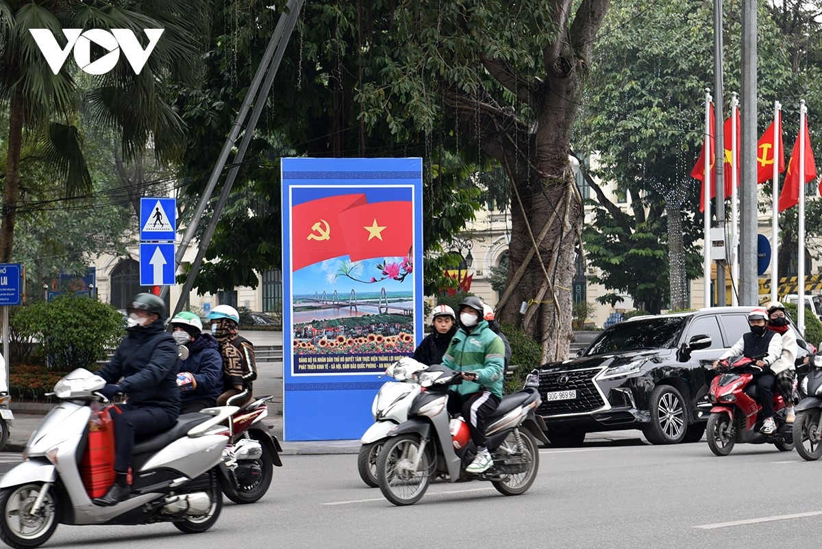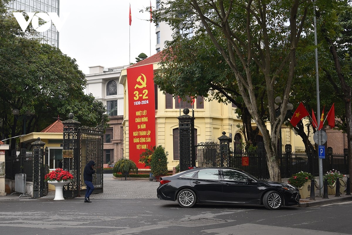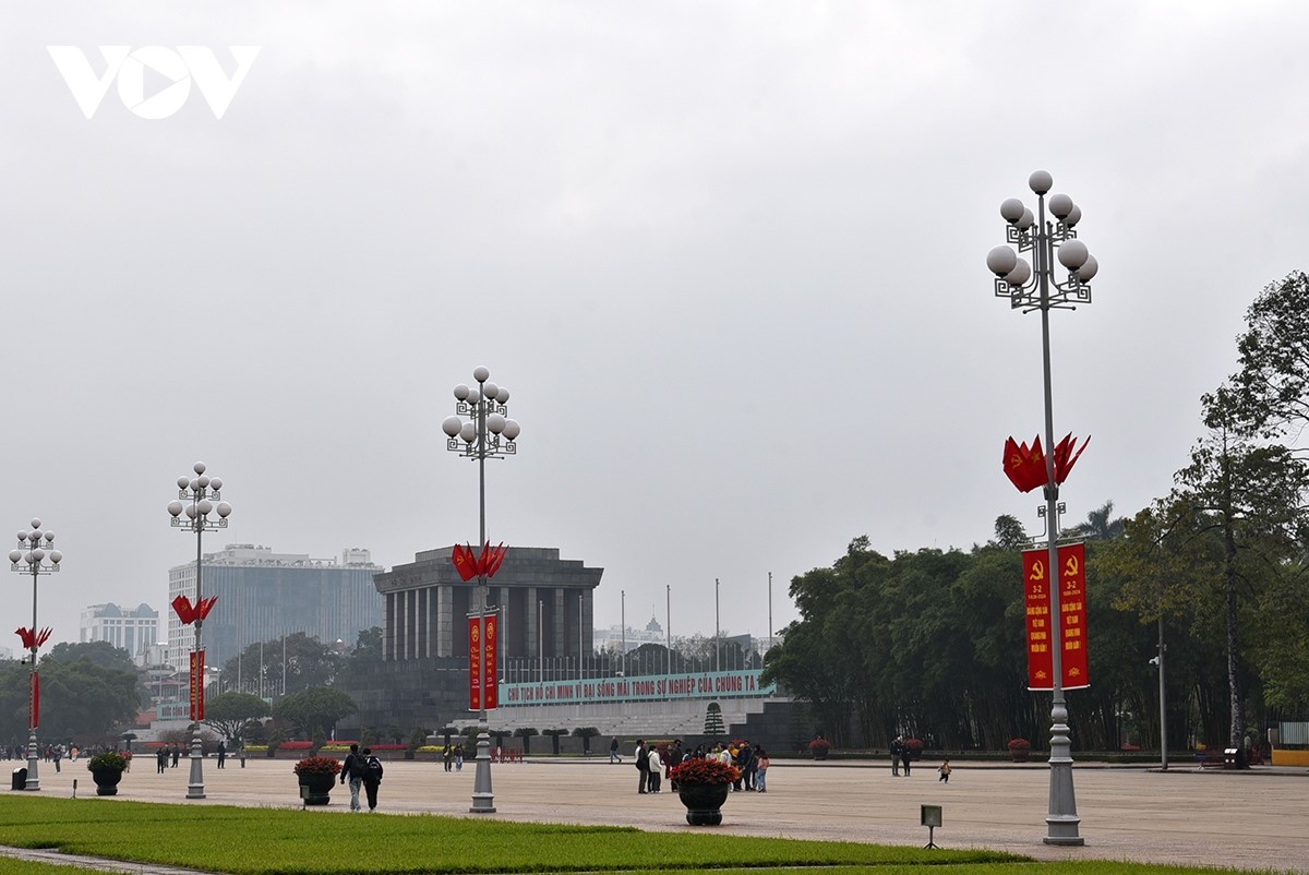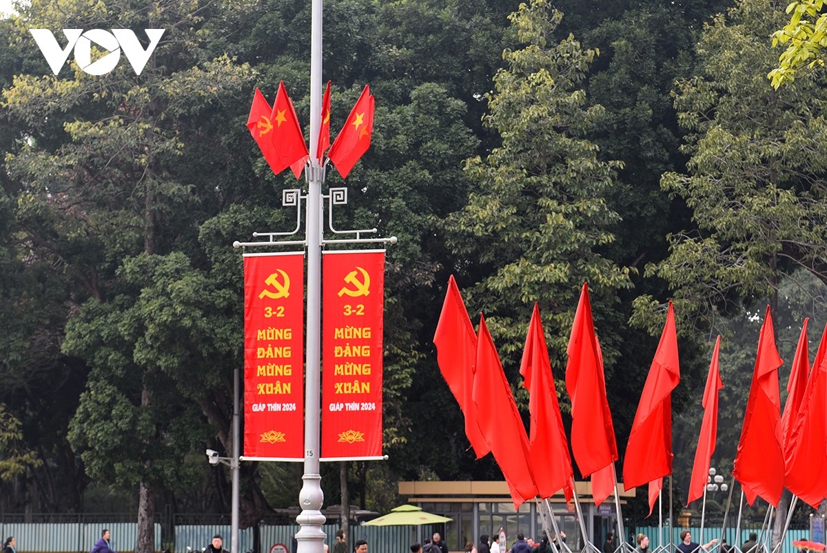 Quảng trường Ba Đình rực rỡ cờ đỏ sao vàng, cờ đảng, băng rôn tuyên truyền mừng Đảng, mừng xuân. |
