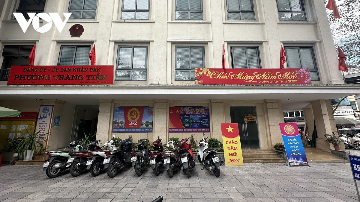 Pano cổ động tuyên truyền mừng Đảng, mừng xuân tại Trụ sở UBND phường Tràng Tiền, quận Hoàn Kiếm. |