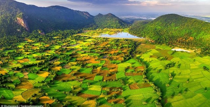 Cánh đồng lúa ở huyện Tri Tôn, tỉnh An Giang, Đồng bằng Sông Cửu Long trông như một "tấm chăn lớn được tạo thành từ nhiều mảnh ghép". Đồng bằng Sông Cửu Long được biết là "vựa lúa" của Việt Nam. |
