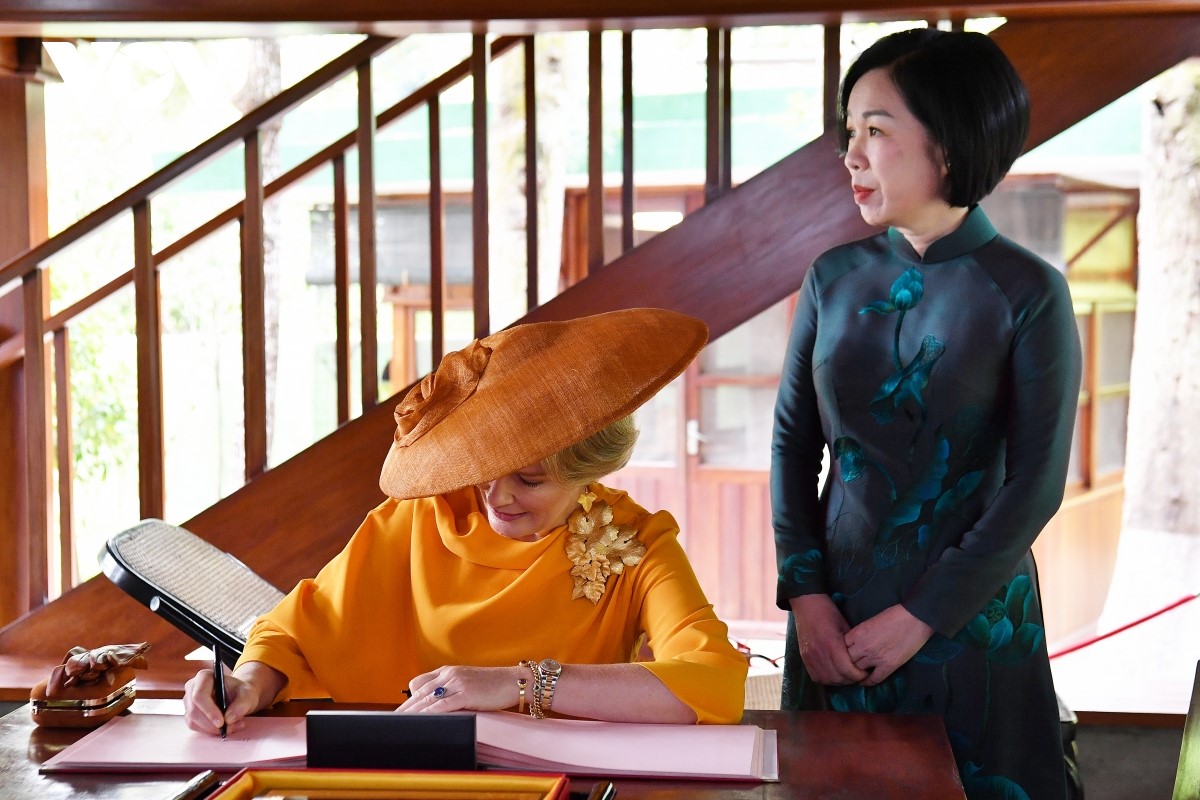 Hoàng hậu Mathilde viết lưu bút, bày tỏ ấn tượng về chuyến tham quan Khu Di tích Chủ tịch Hồ Chí Minh. |