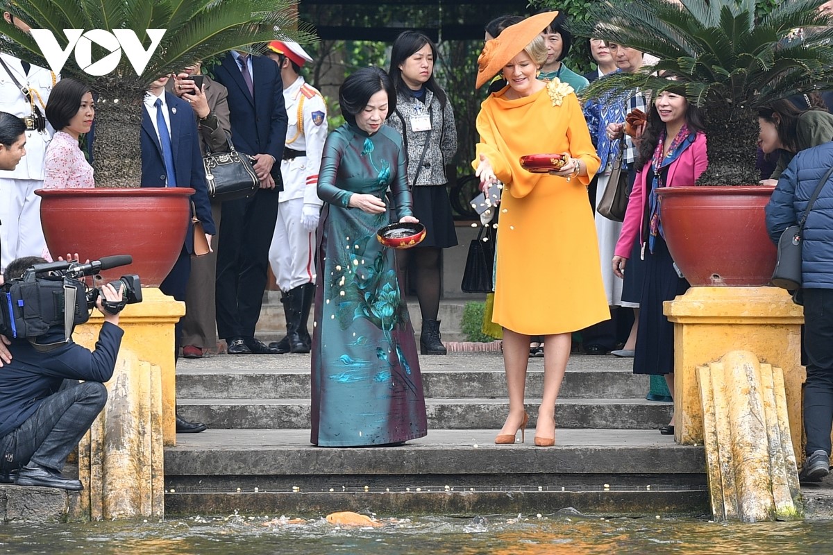 Nhà sàn Bác Hồ là ngôi nhà sàn đơn sơ, giản dị nằm bên cạnh hồ nước trong xanh, giữa một vườn cây xanh mát đã trở thành hình ảnh thân thuộc, là biểu trưng cho giá trị đạo đức, tư tưởng và phong cách sống vô cùng giản dị mà thanh cao của Chủ tịch Hồ Chí Minh. Trong ảnh: Phu nhân Nguyễn Thị Minh Nguyệt cùng Hoàng hậu Mathilde cho cá ăn tại Ao cá Bác Hồ. |