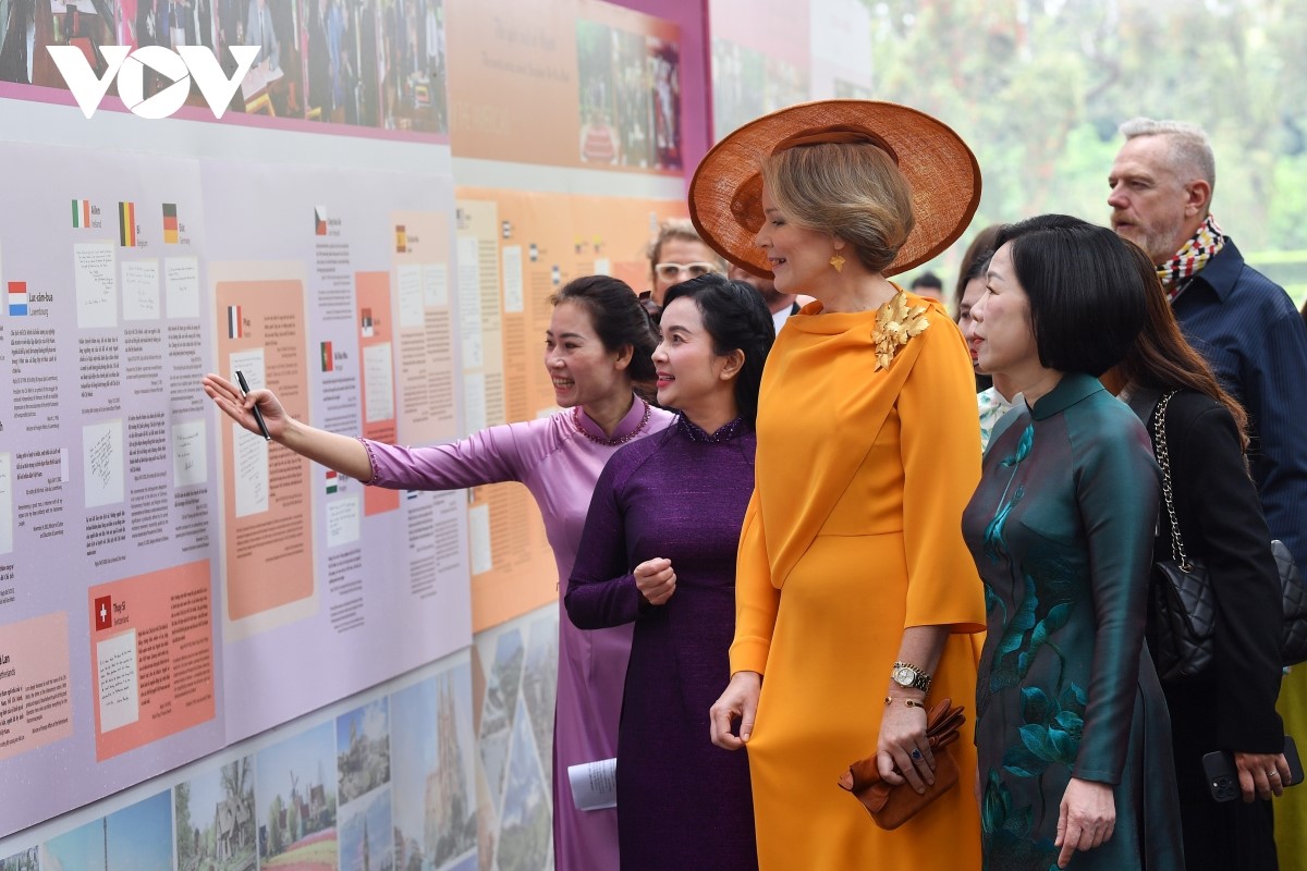 Phu nhân Nguyễn Thị Minh Nguyệt cùng Hoàng hậu Mathilde tham quan triển lãm tại Khu Di tích Chủ tịch Hồ Chí Minh. |