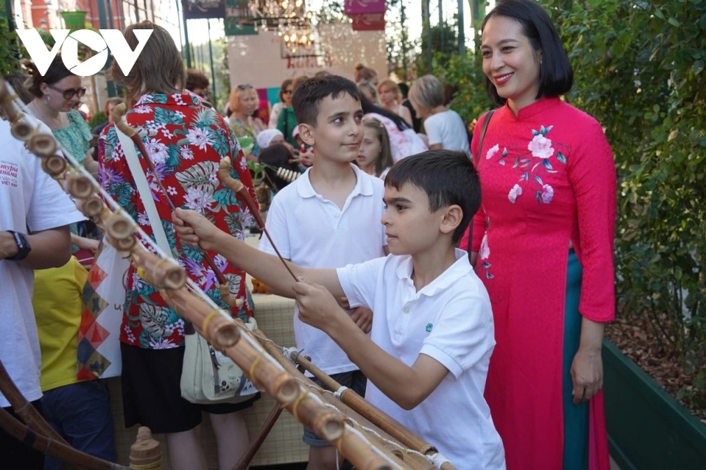 | Trẻ em Nga thích thú trải nghiệm nhạc cụ dân tộc Việt Nam |