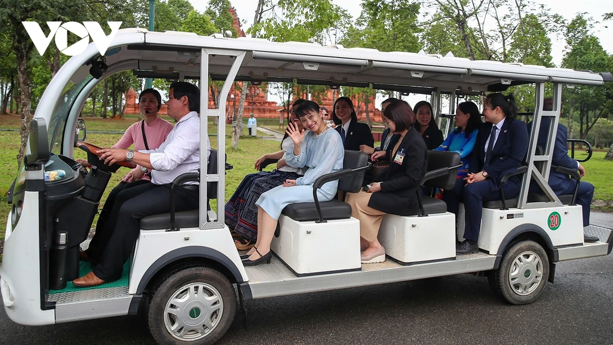 | Hai Phu nhân và đoàn tham quan quần thể tháp Chăm. |