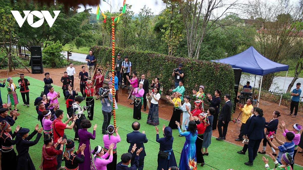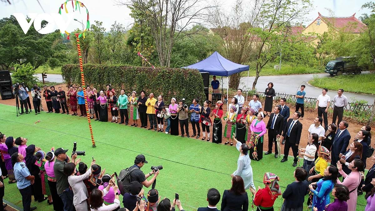 | Hai Phu nhân đã tới thăm làng của đồng bào người Thái đang sinh sống tại Làng Văn hóa - Du lịch các dân tộc Việt Nam. |