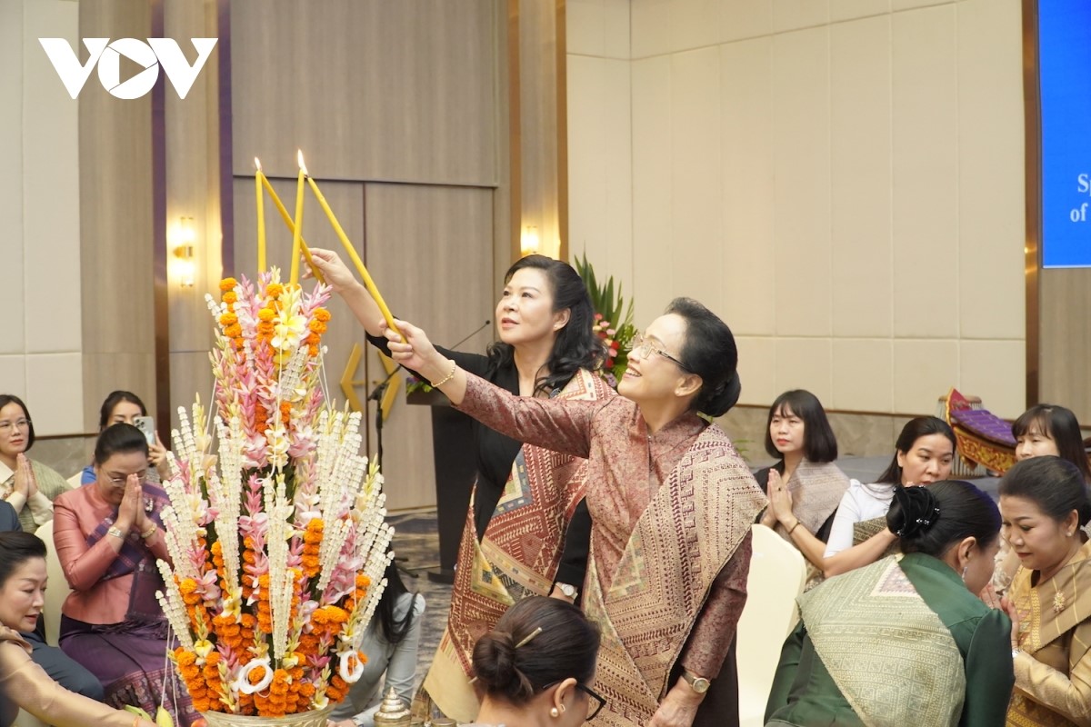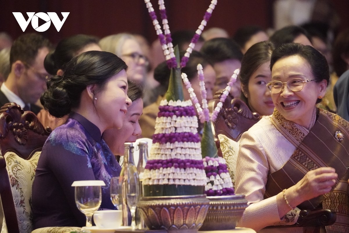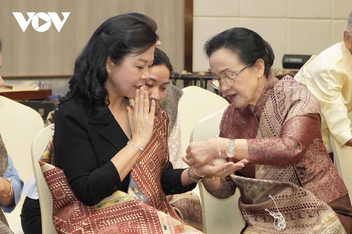 Phu nhân của Tổng Bí thư Tô Lâm và phu nhân của Tổng Bí thư, Chủ tịch nước Lào Thonglloun Sisoulith thực hiện Lễ buộc chỉ tay (lễ sù khoẳn). |