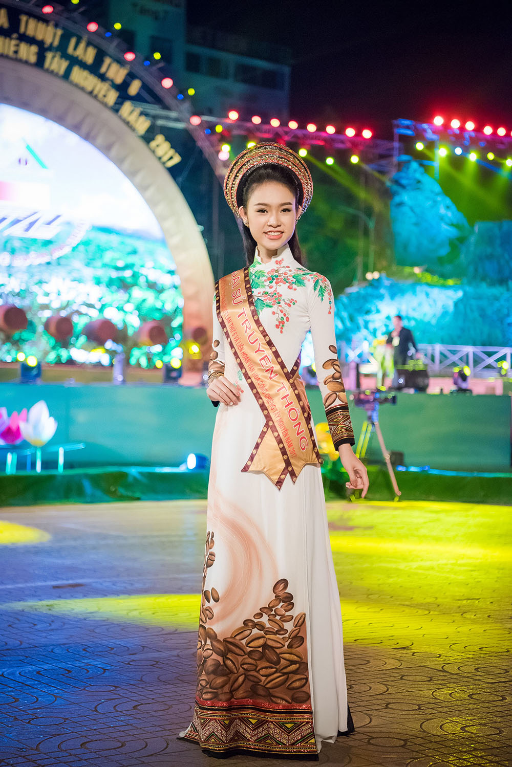 Bộ áo dài với chiếc mấn độc đáo ba tầng càng khiến cho Ngọc Vân nổi bật trên sân khấu. Cô chọn cách trang điểm nhẹ nhàng, làm toả sáng nhan sắc dịu dàng nhưng không kém phần khả ái. Nhan sắc xinh đẹp của ‘cô gái vàng’ cuộc thi Hoa hậu Việt Nam 2016 khiến khán giả Tây Nguyên không ngớt lời khen ngợi.