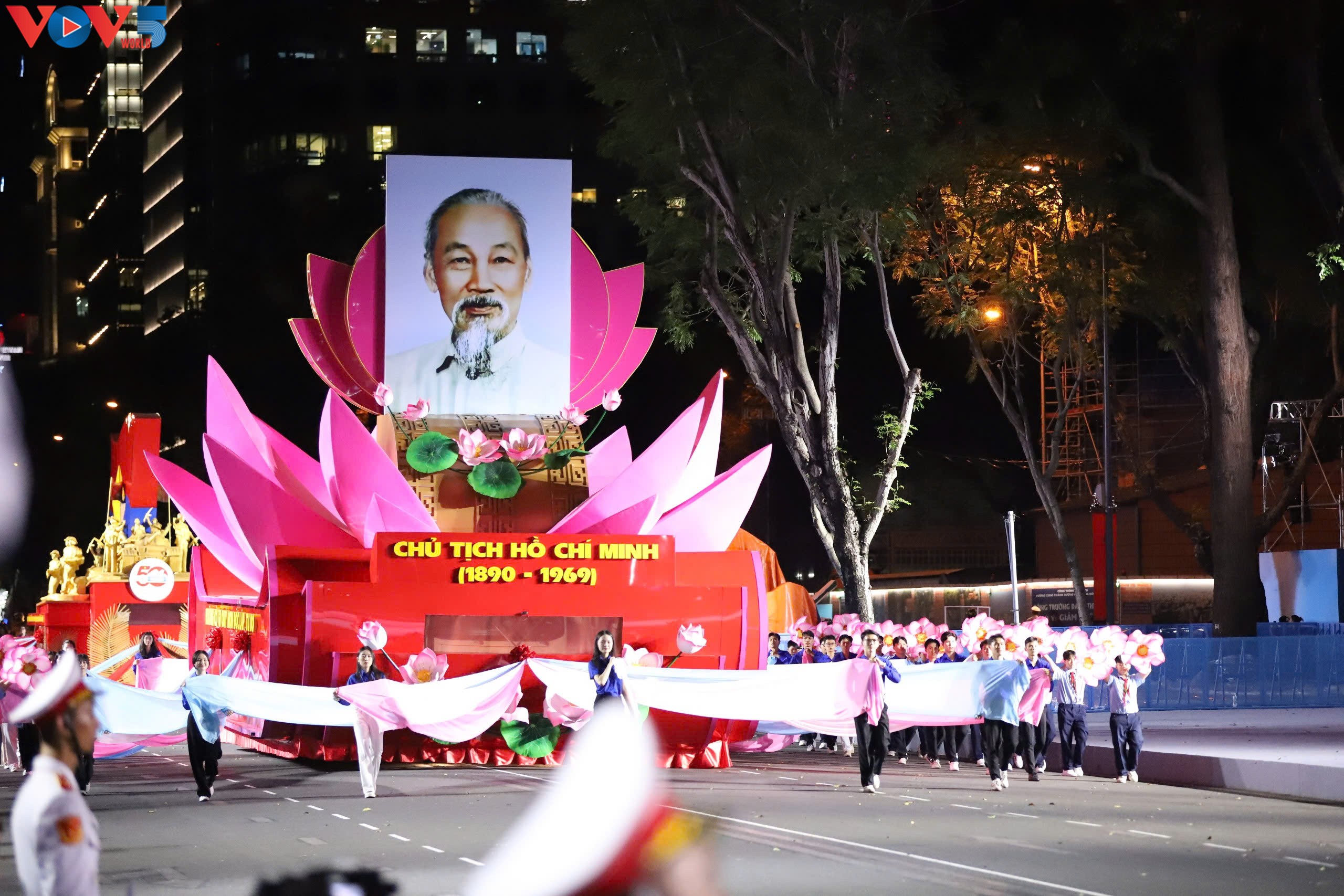 | Lần đầu tiên buổi hợp luyện có sự tham gia của khối Nghi trượng. Trong ảnh là chân dung Chủ tịch Hồ Chí Minh được rước qua lễ đài |