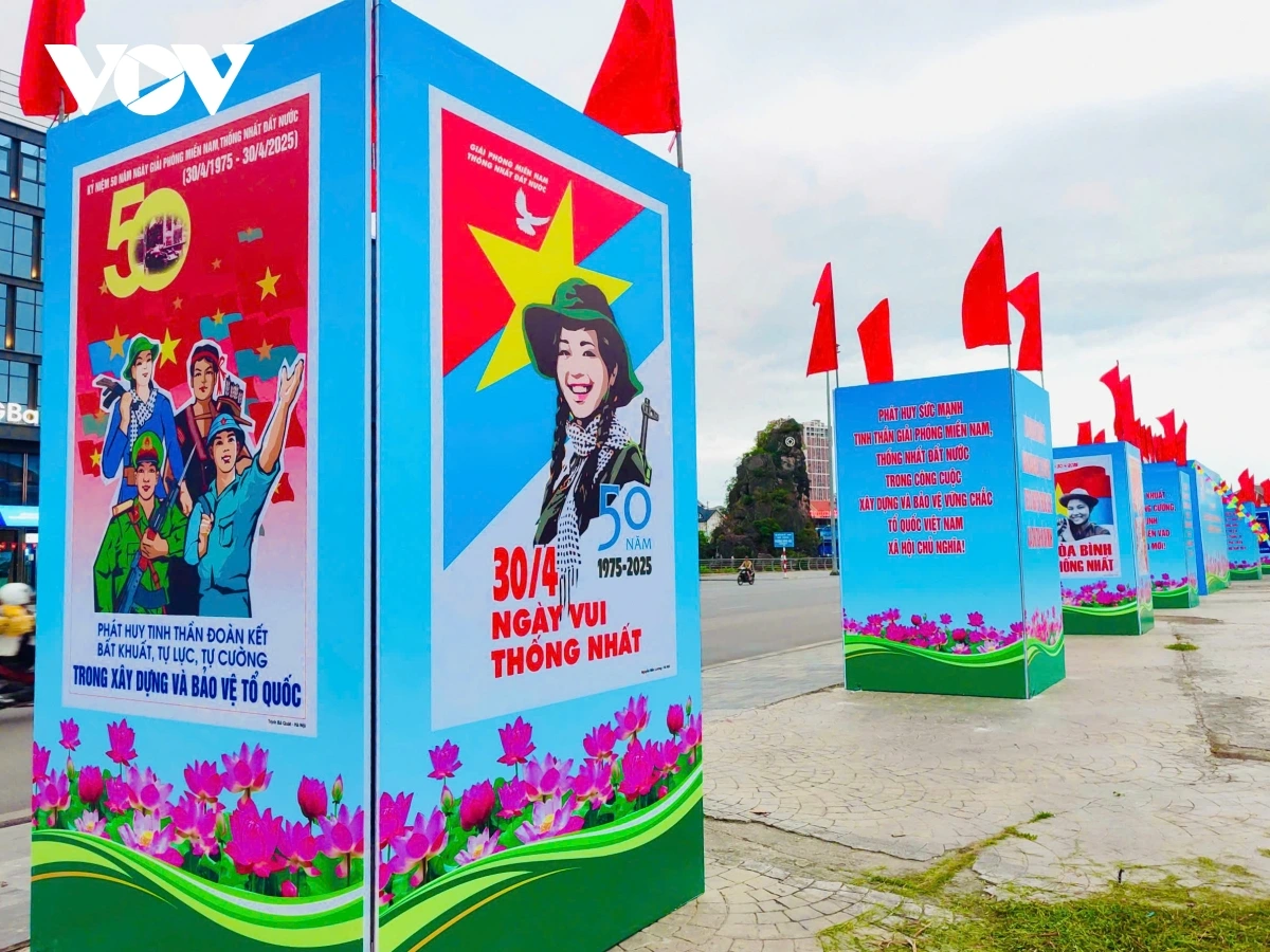 | Rực rỡ nhất là tại khu vực quảng trường 30/10, thành phố Hạ Long. Các pano, áp phích khổ lớn nối dài cùng tuyên truyền về ý nghĩa lịch sử Ngày Giải phóng miền Nam, thống nhất đất nước (30/4/1975 - 30/4/2025) và 139 năm Ngày Quốc tế Lao động (01/5/1886-01/5/2025), vừa nhắc nhớ về ngày Thống nhất đất nước, vừa tạo ấn tượng cho người dân và du khách. |