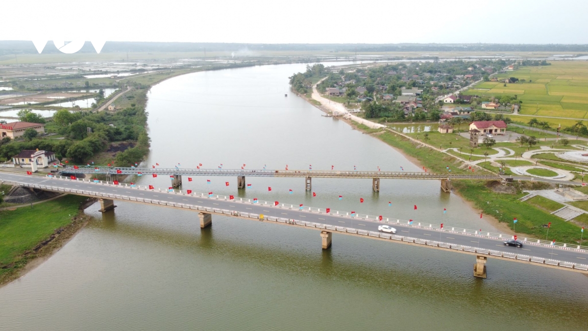 Trước ngày 30/4 lịch sử, tại Quảng Trị rợp cờ hoa, mỗi lá cờ Tổ quốc phấp phới tung bay, khơi dậy niềm tự hào của mỗi người dân. Trong ảnh: Sắc màu cờ đỏ sao vàng tung bay trên cầu Hiền Lương bắc qua sông Bến Hải