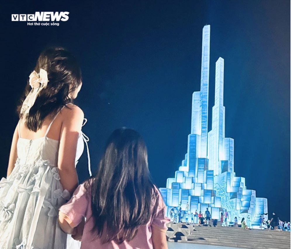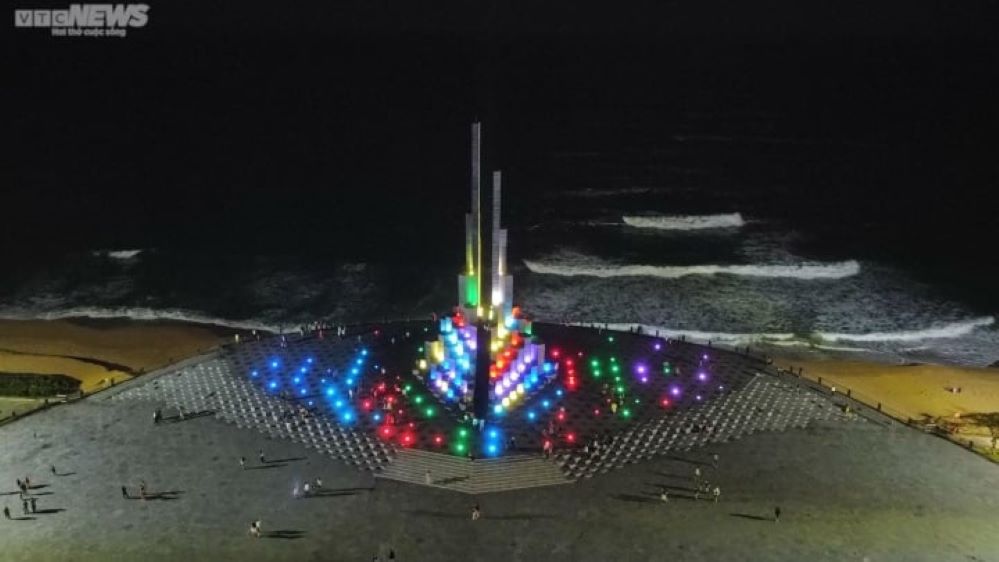 Về ban đêm, Tháp Nghinh Phong được chiếu sáng với công nghệ Boline - Tesia 3D Mapoping và laze có cường độ cao, tạo nên vũ điệu ánh sáng đa sắc màu, hòa trong tiếng vi vút cất lên từ gió biển qua khe nghinh phong của tháp. Ảnh: vtc.vn