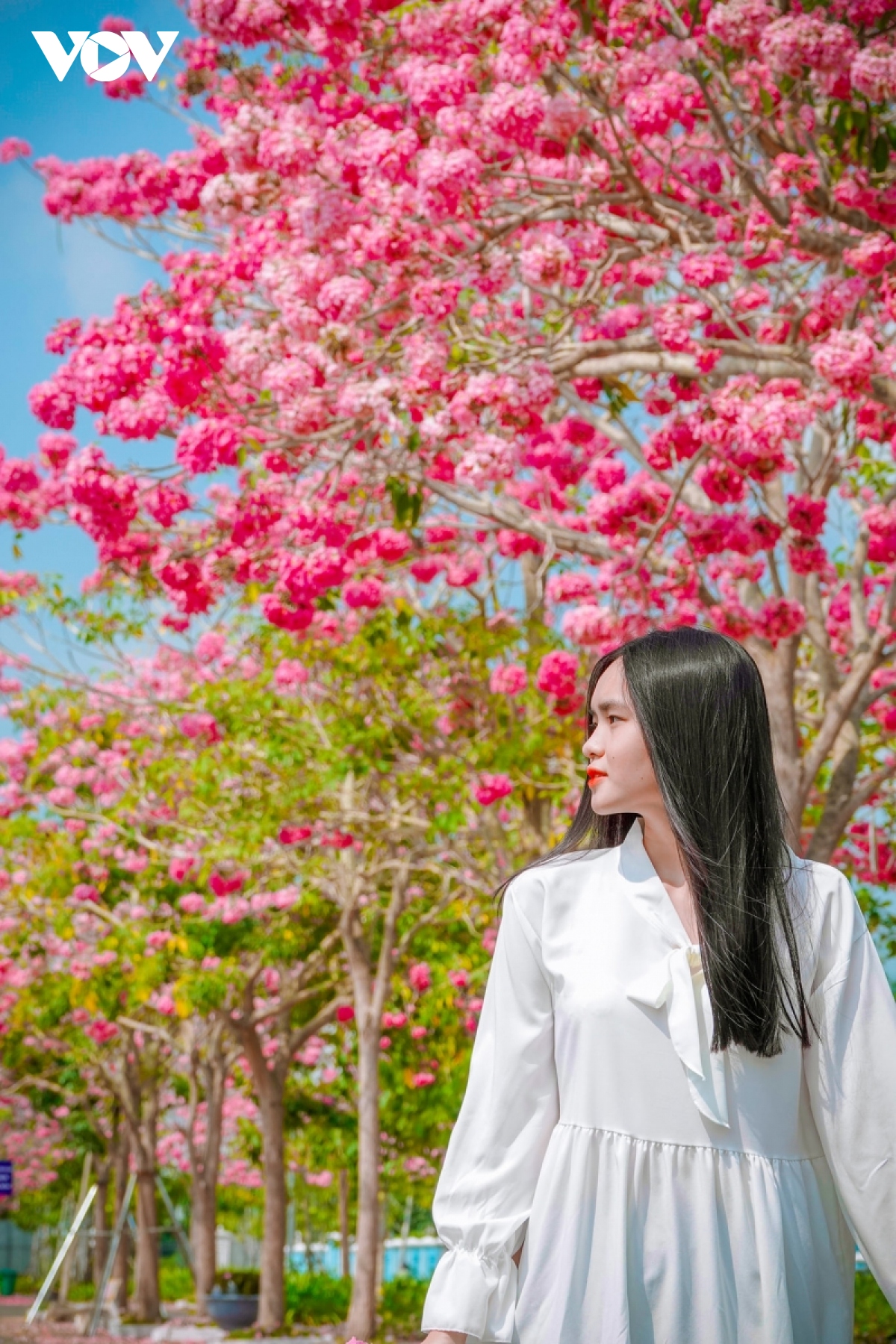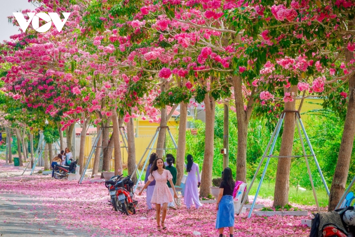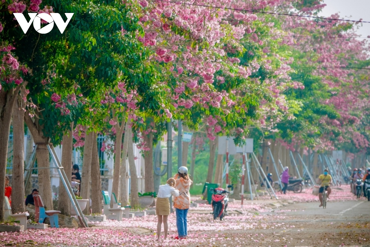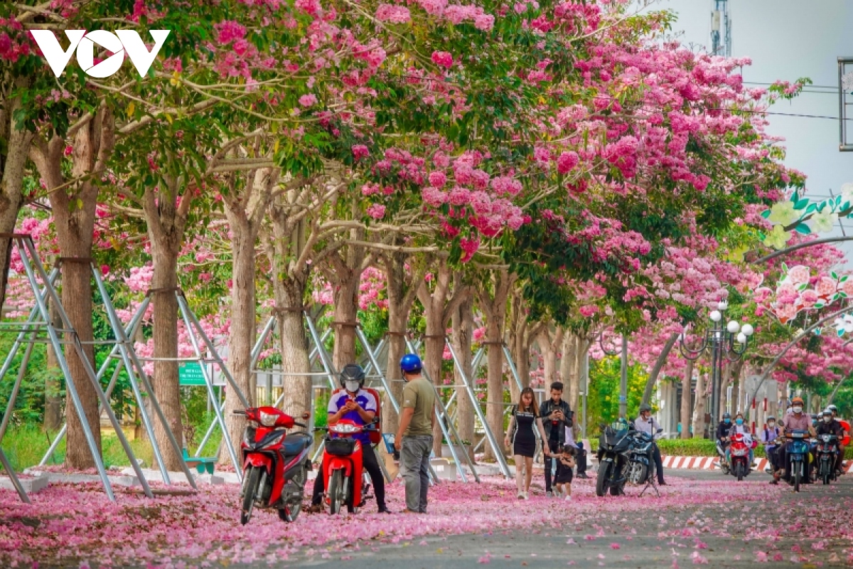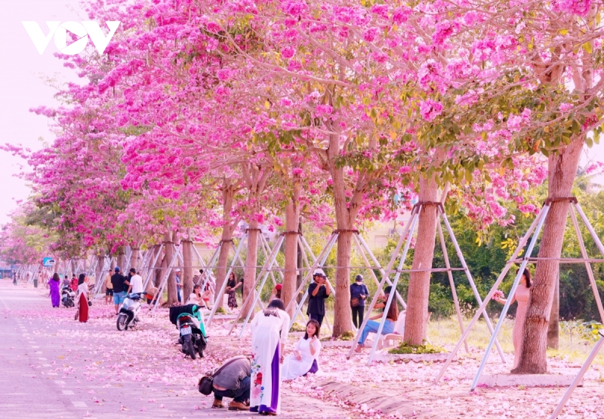 Dưới ánh nắng miền Tây, đường hoa kèn hồng Sóc Trăng hệt như một dải lụa hồng êm ả, thu hút nhiều người dừng chân