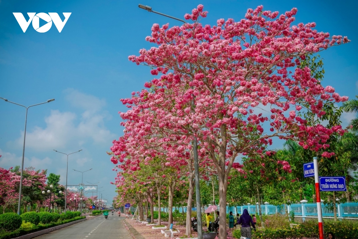 Con đường hoa kèn hồng nổi tiếng gần đây ở miền Tây nằm tại đường Hùng Vương, huyện Châu Thành, tỉnh Sóc Trăng.