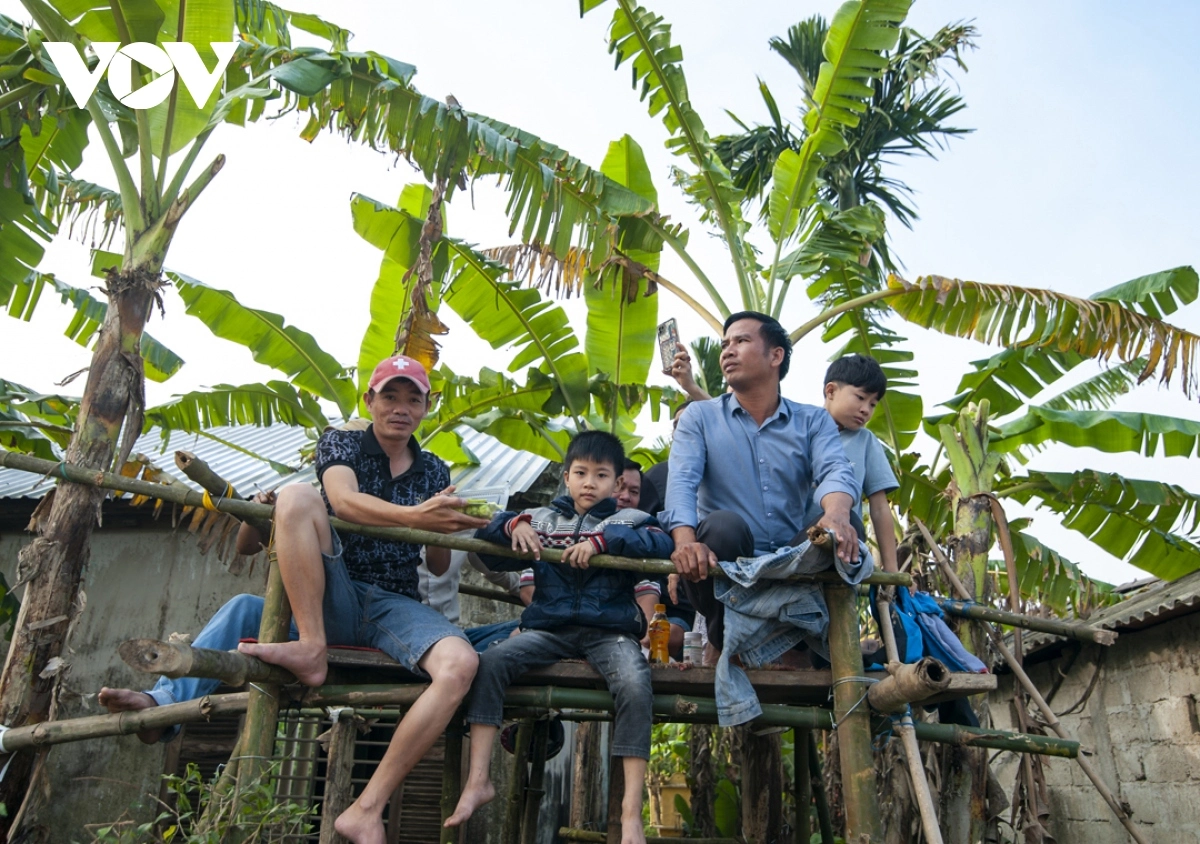 Các em nhỏ được bố mẹ cõng lên vai để theo dõi đua trải từ sáng sớm